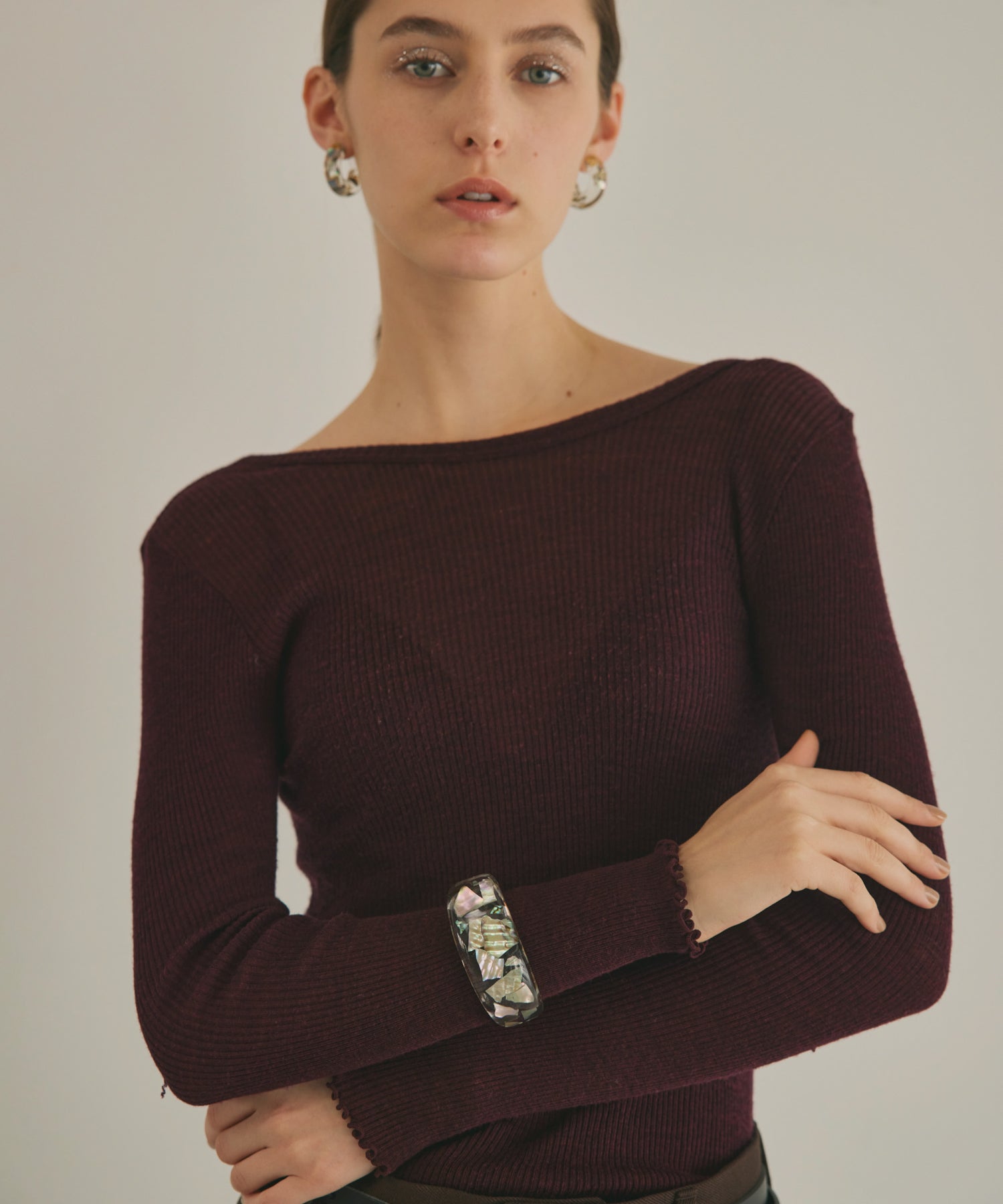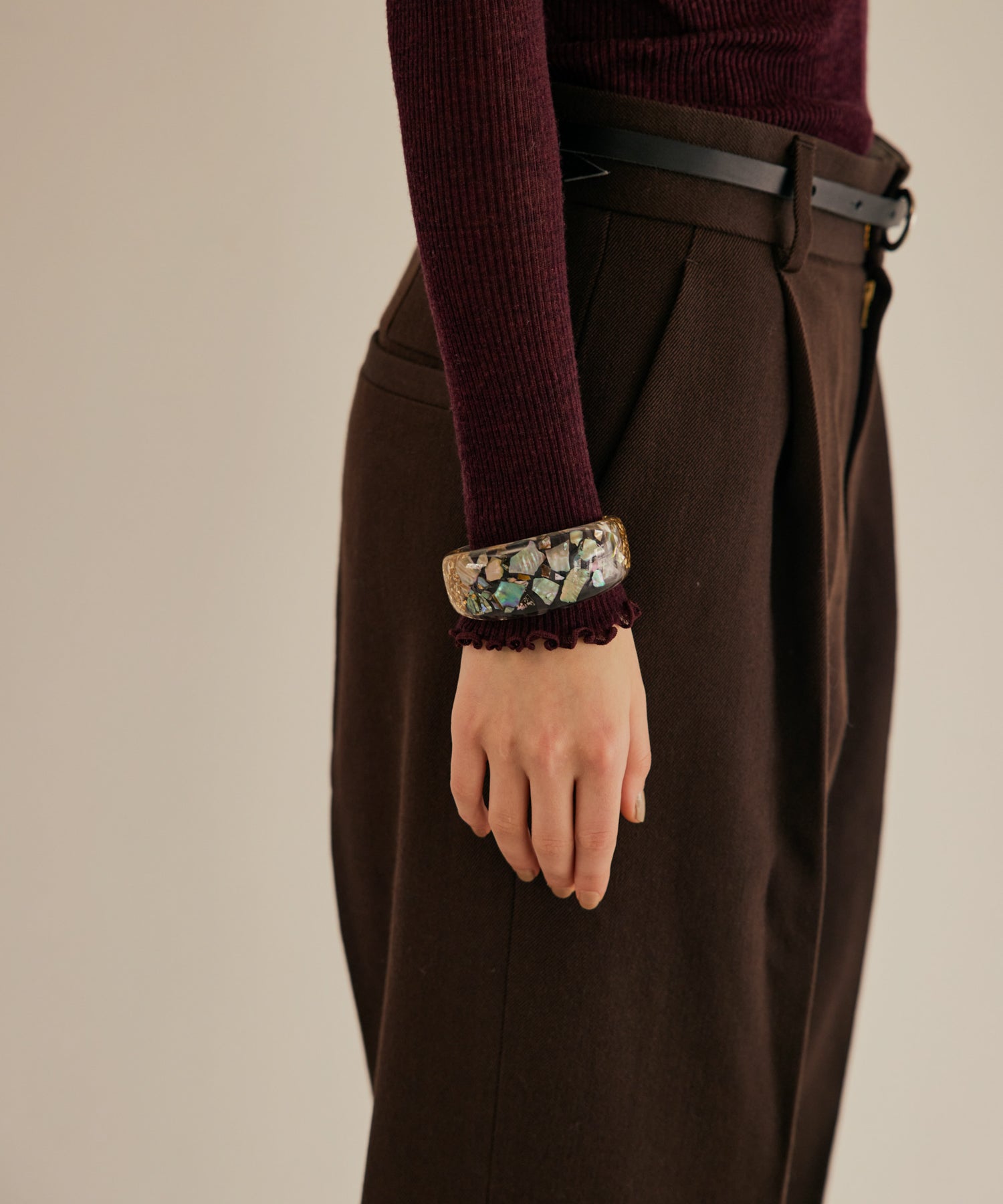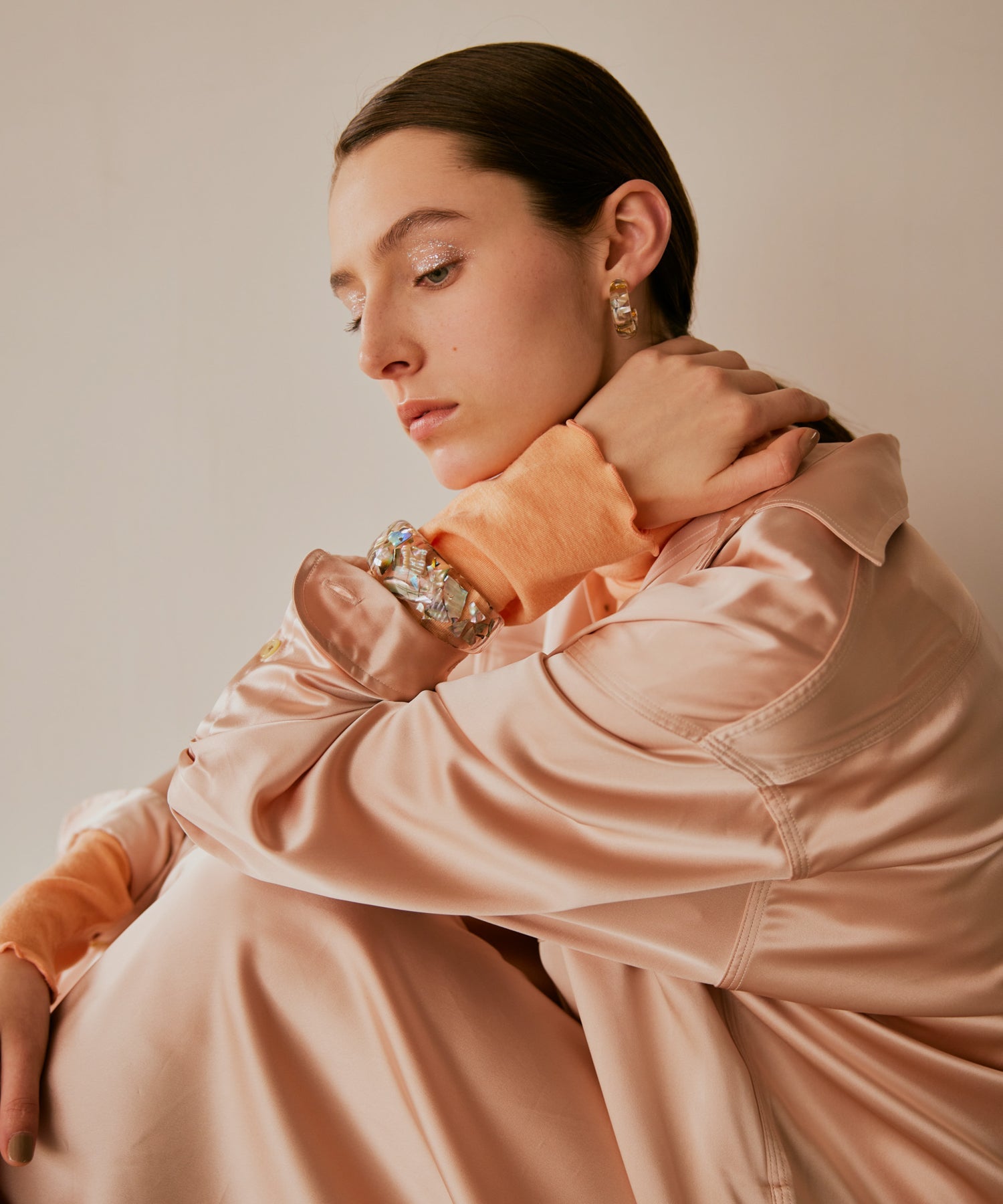 ・透明感のある樹脂なのでシャツやインナーの上からバングルをはめレイヤードを楽しむ事ができます。