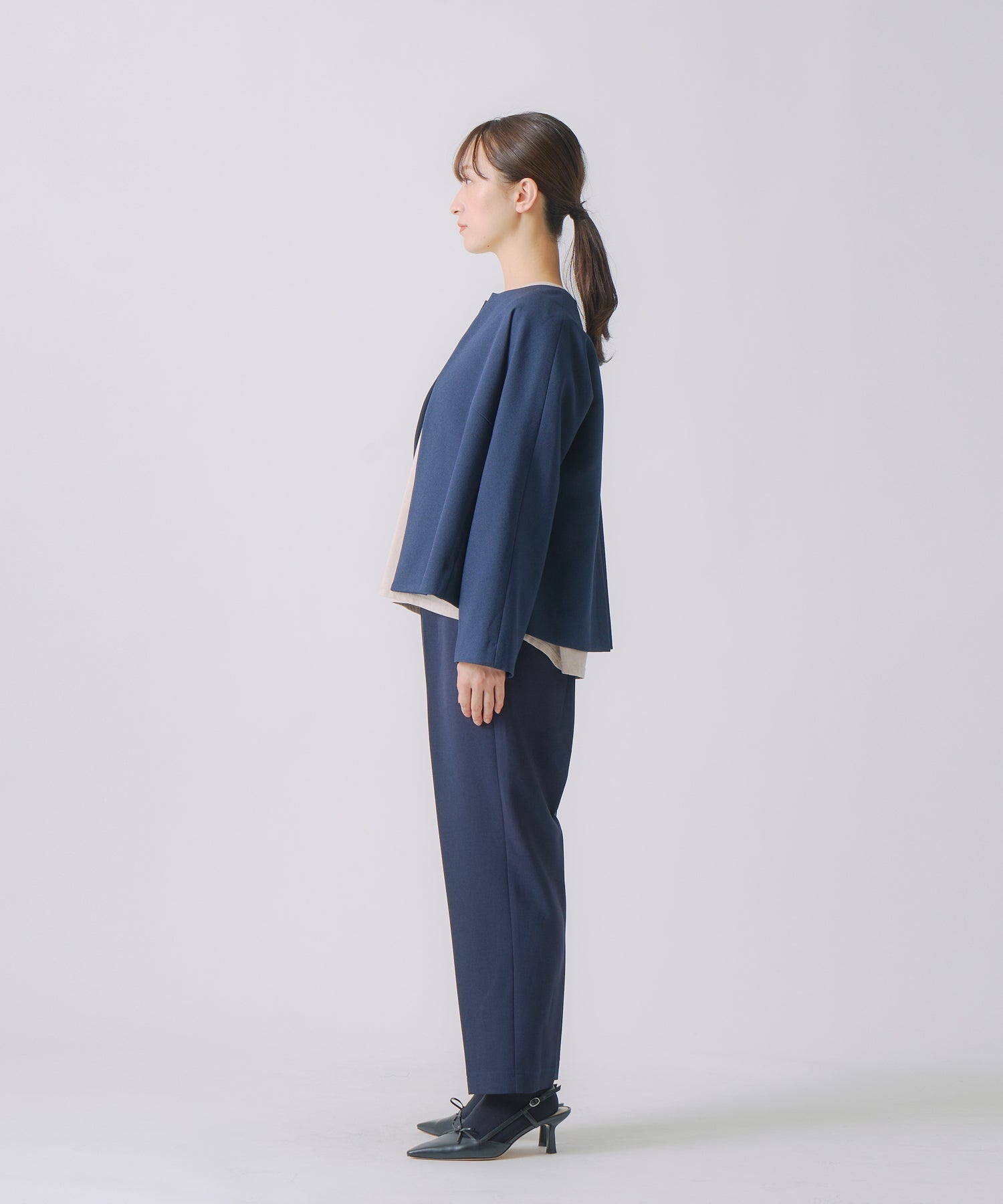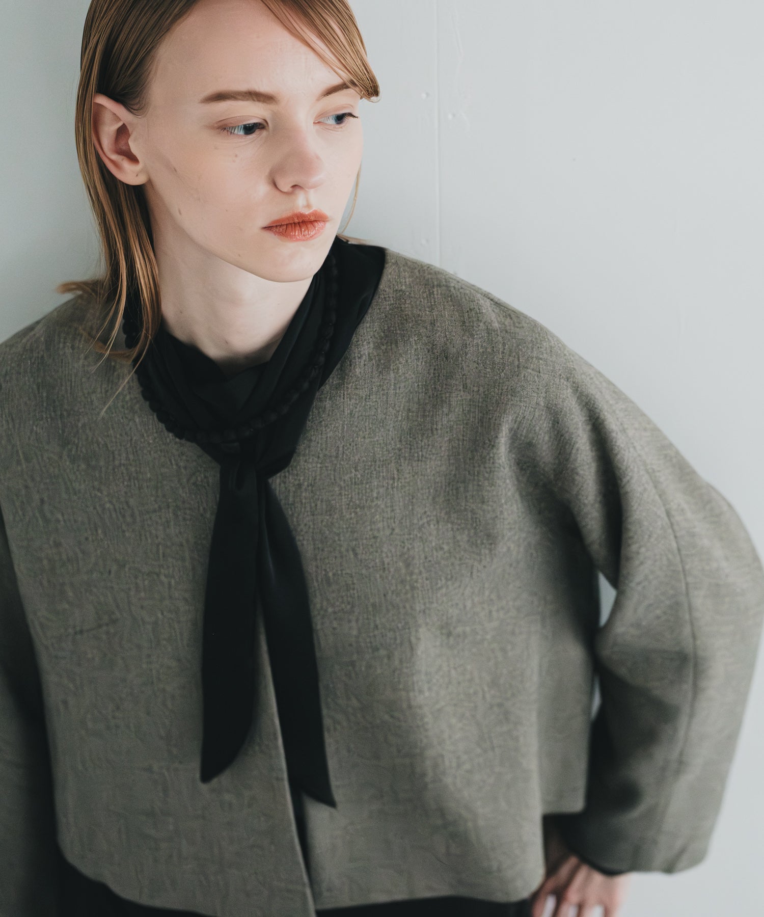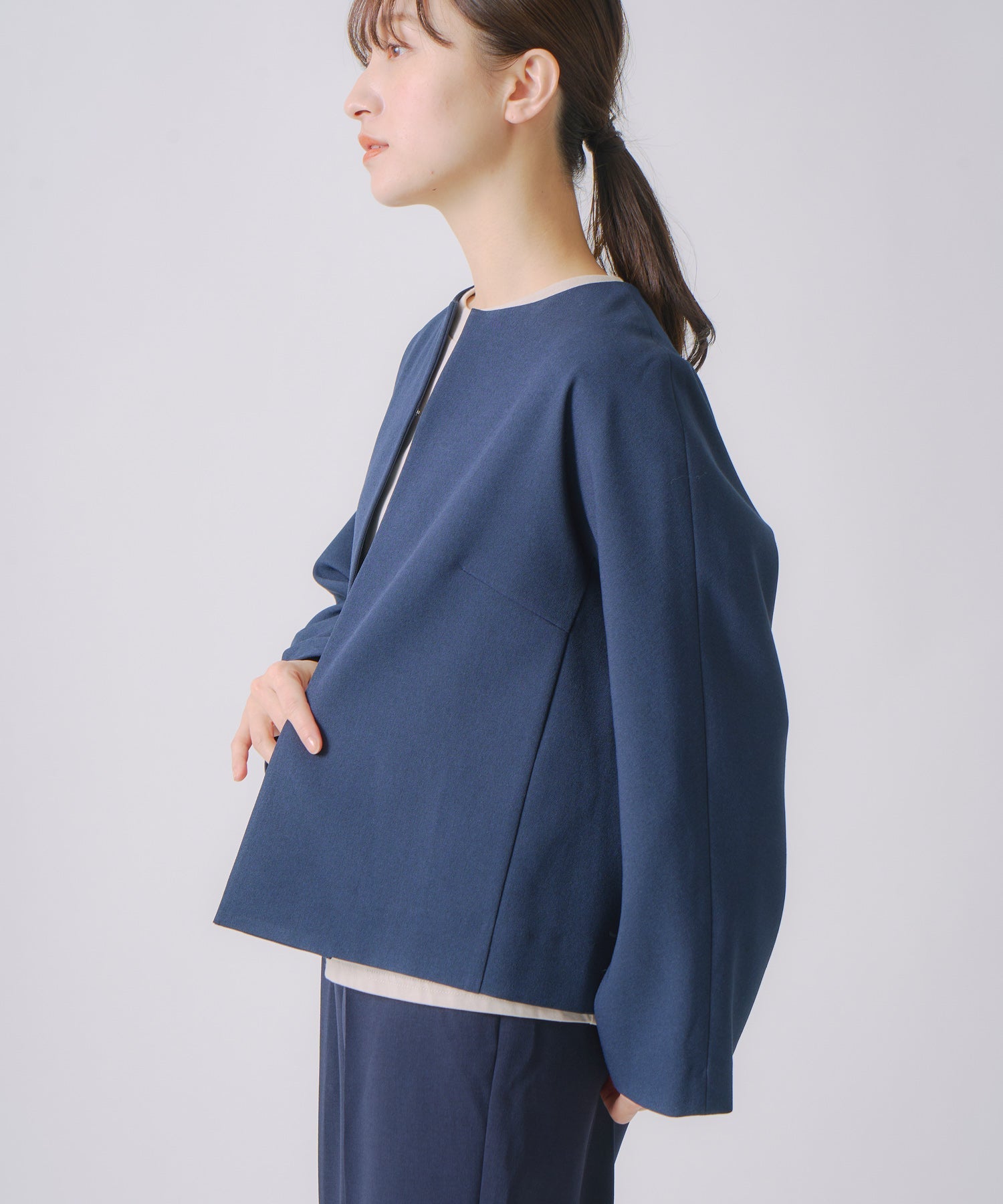 ウールライクなフィラメントでシンプルに軽く仕上げたノーカラージャケットです。