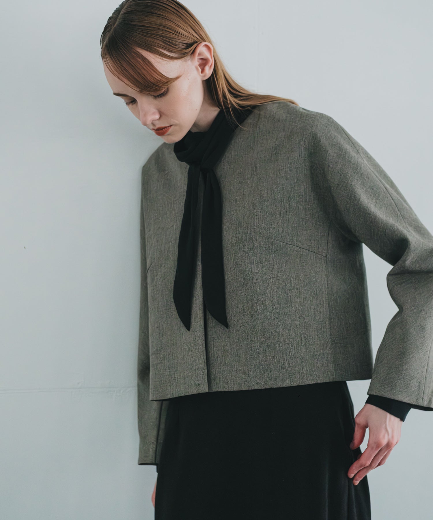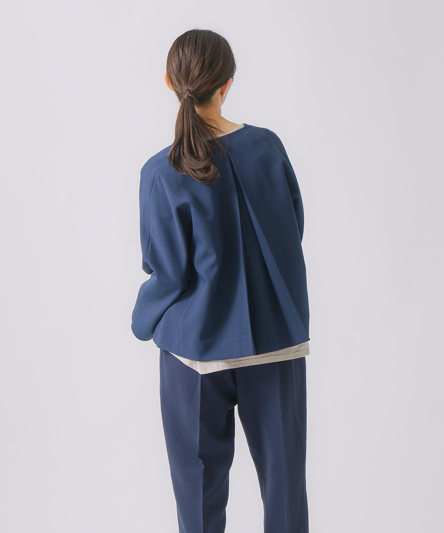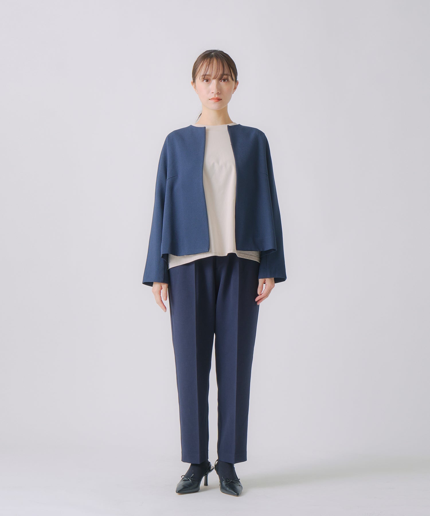 ウールライクなフィラメントでシンプルに軽く仕上げたノーカラージャケットです。