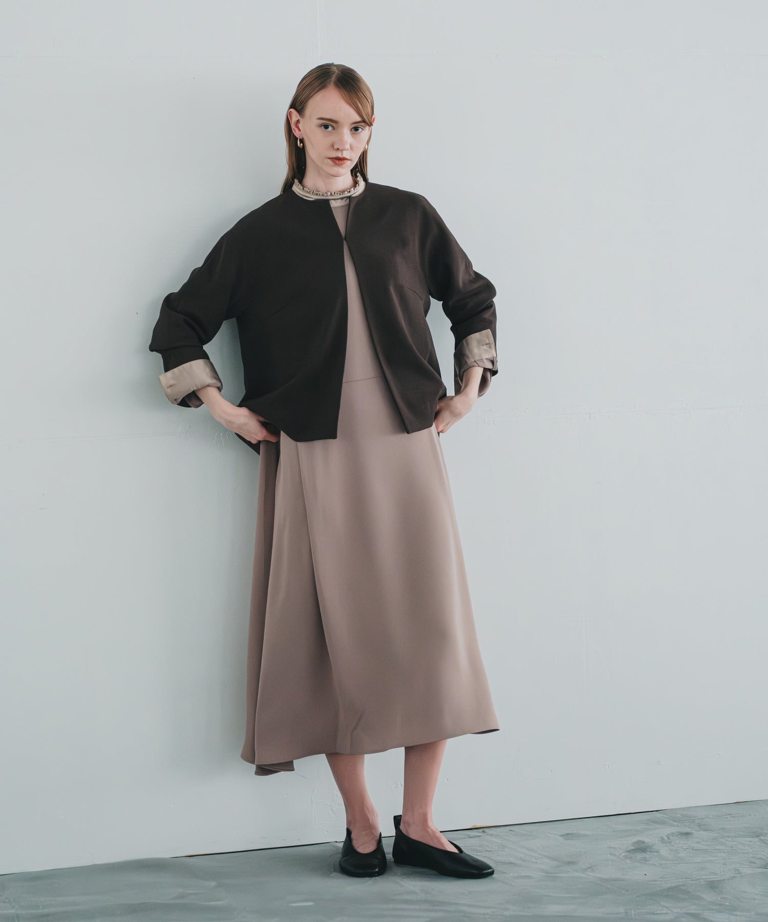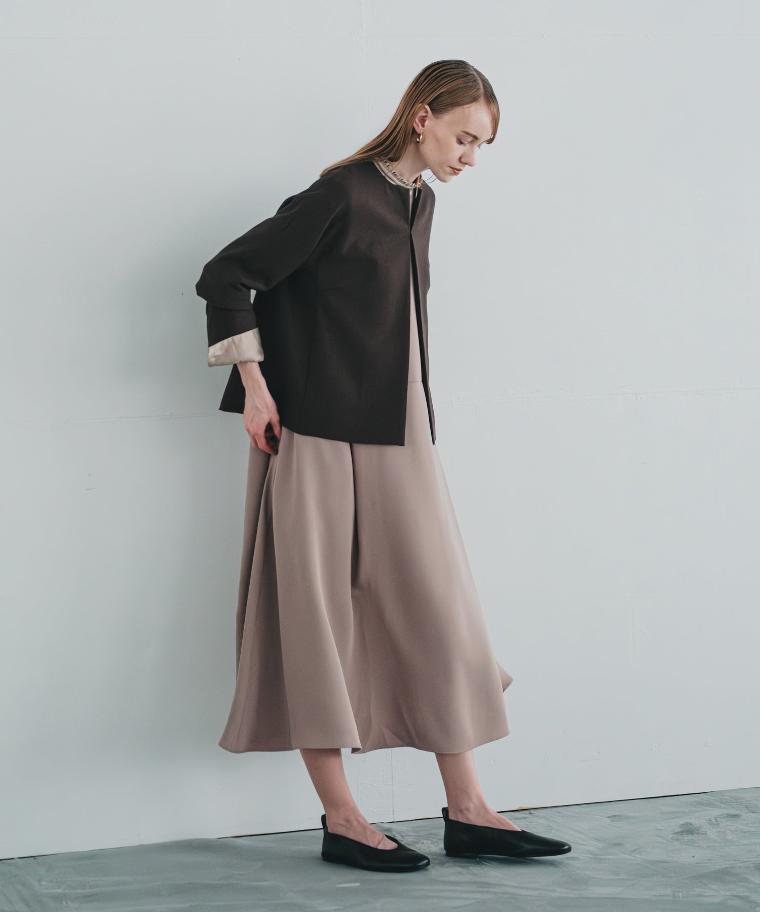 フロントは、開けてスッキリ着用できる様なラインを意識していますが、1箇所ホック留めできるディティールを作っており、シーンごとで着用方法を選んでいただけます。