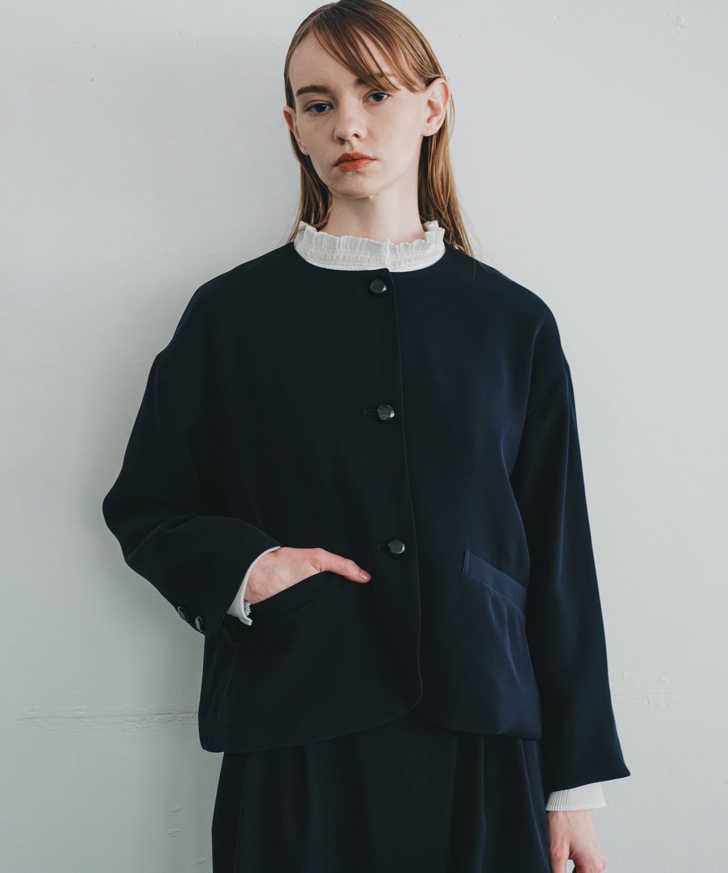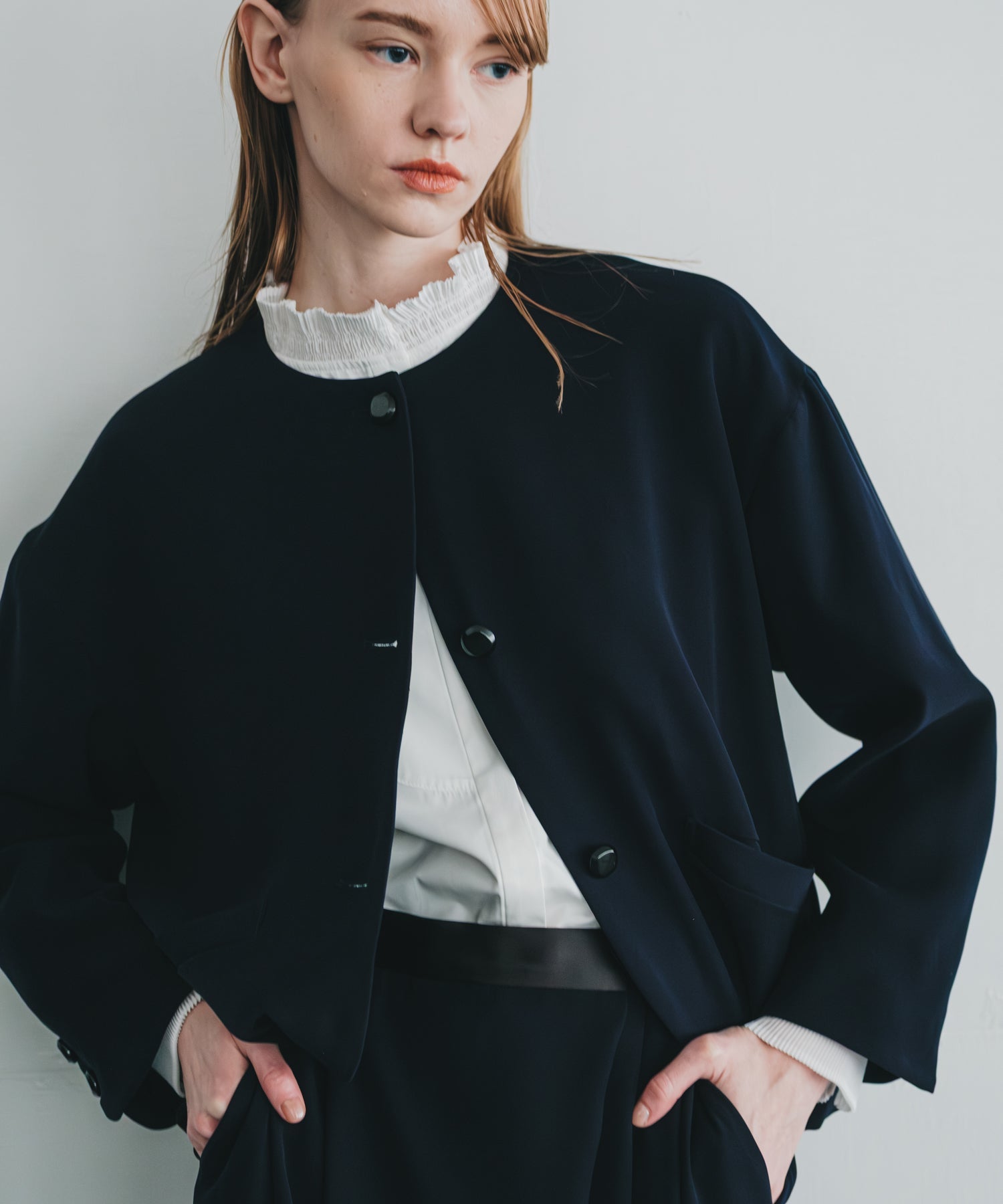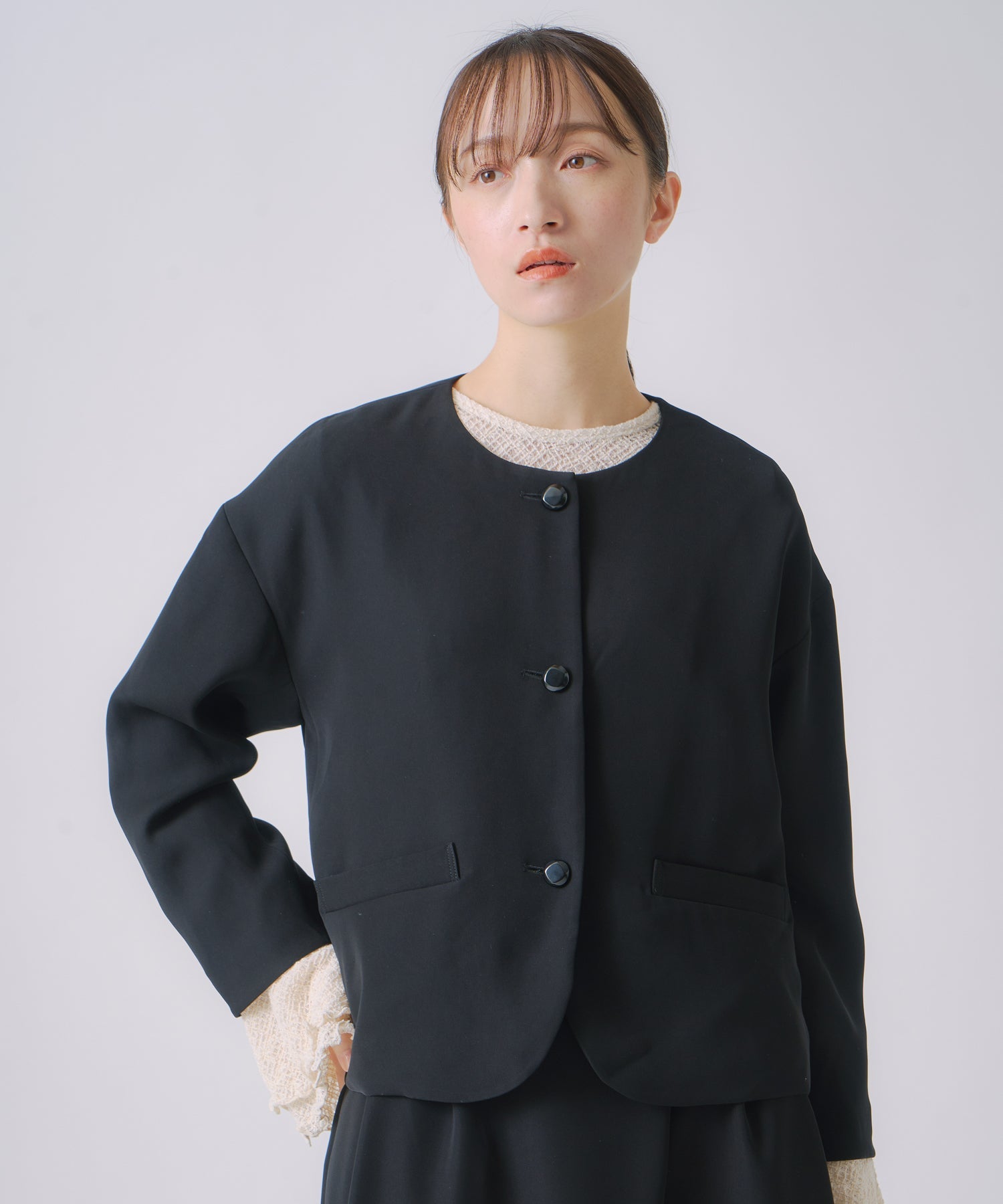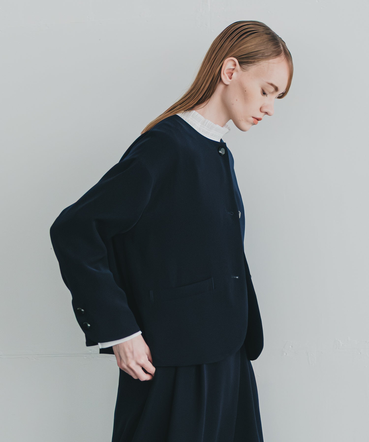ノーカラーですっきりした印象を持たせながら、ヘムラインに丸みを帯びたラインを効かせたジャケットです。