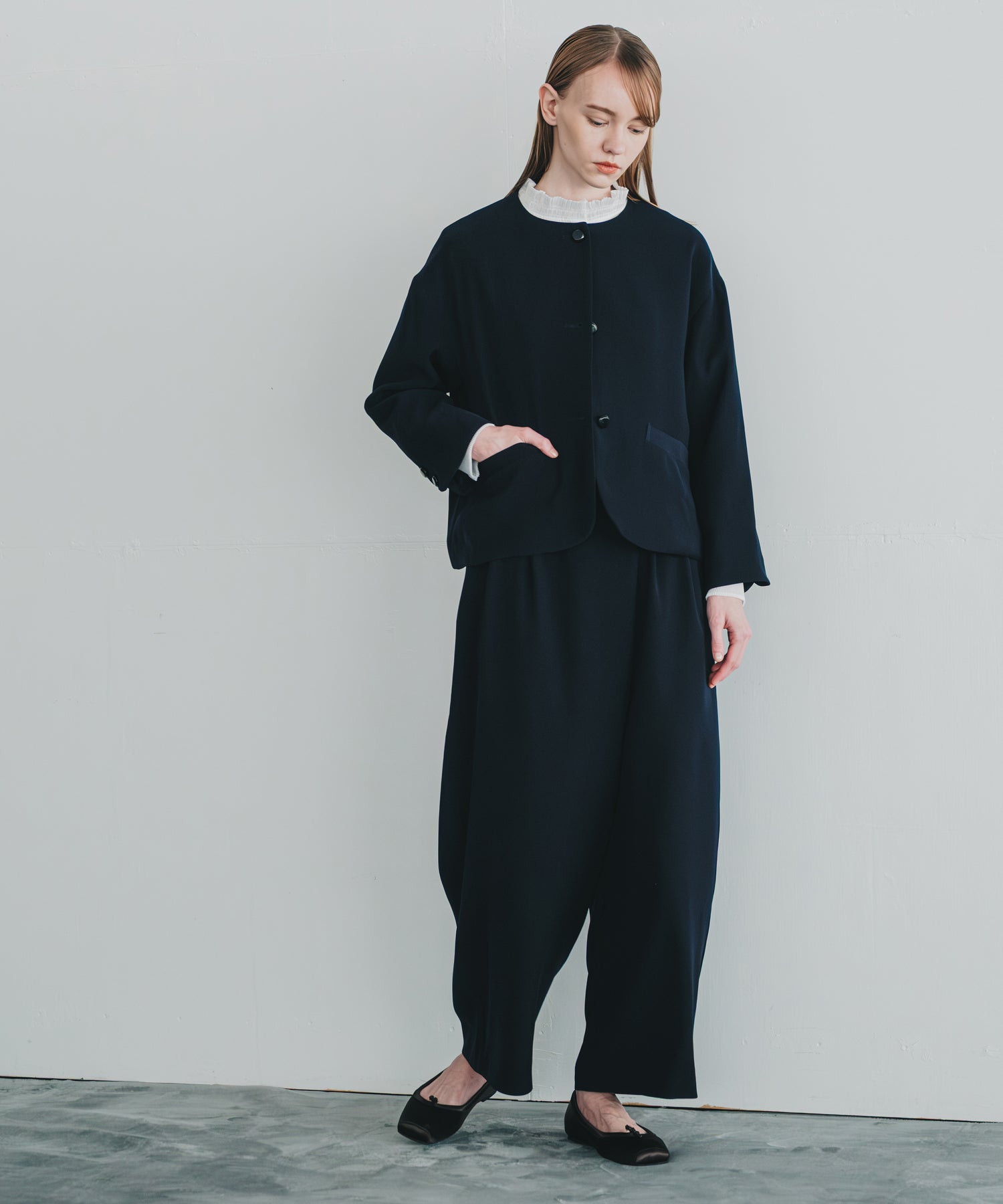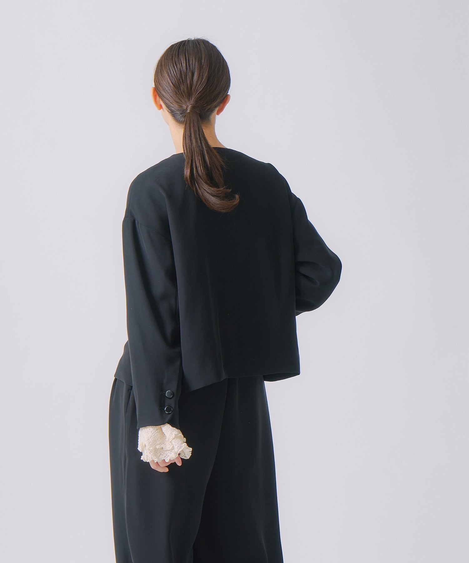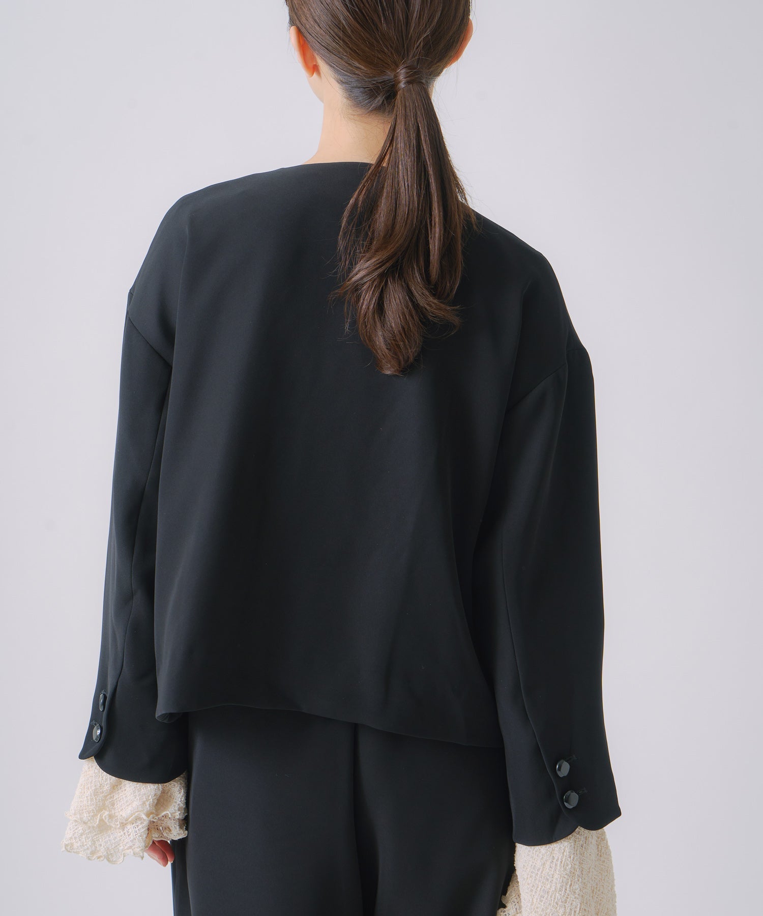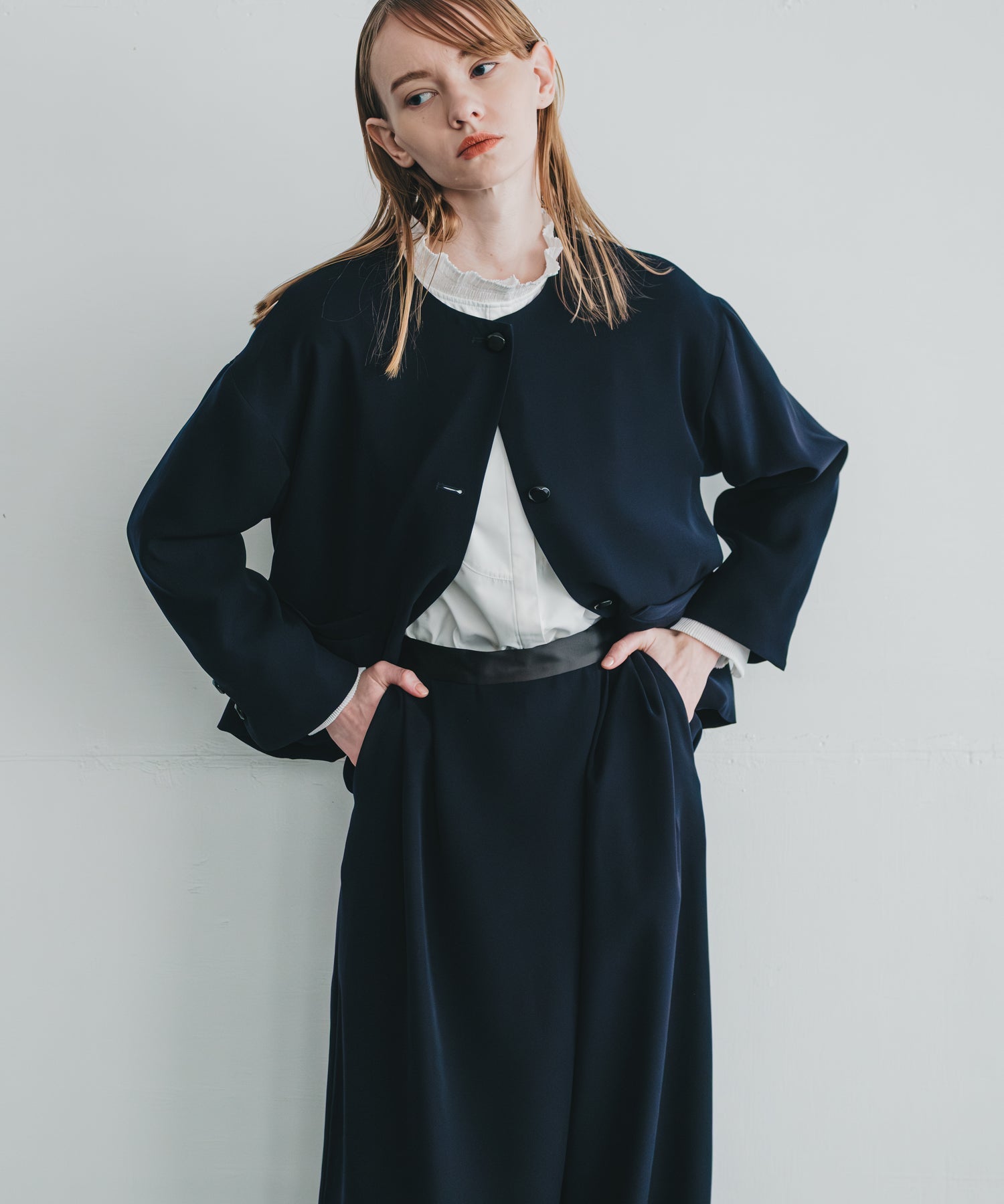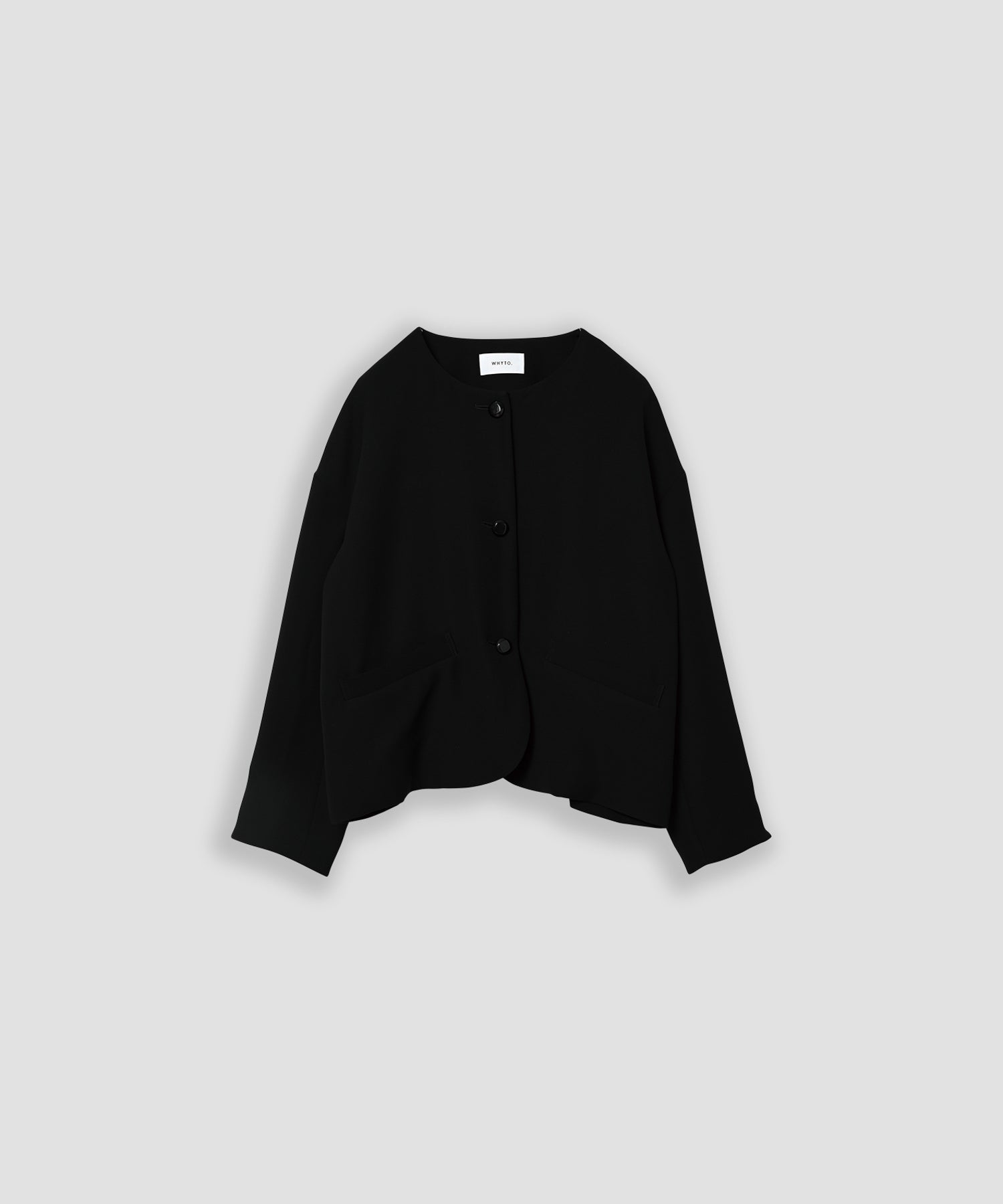 ノーカラーですっきりした印象を持たせながら、ヘムラインに丸みを帯びたラインを効かせたジャケットです。