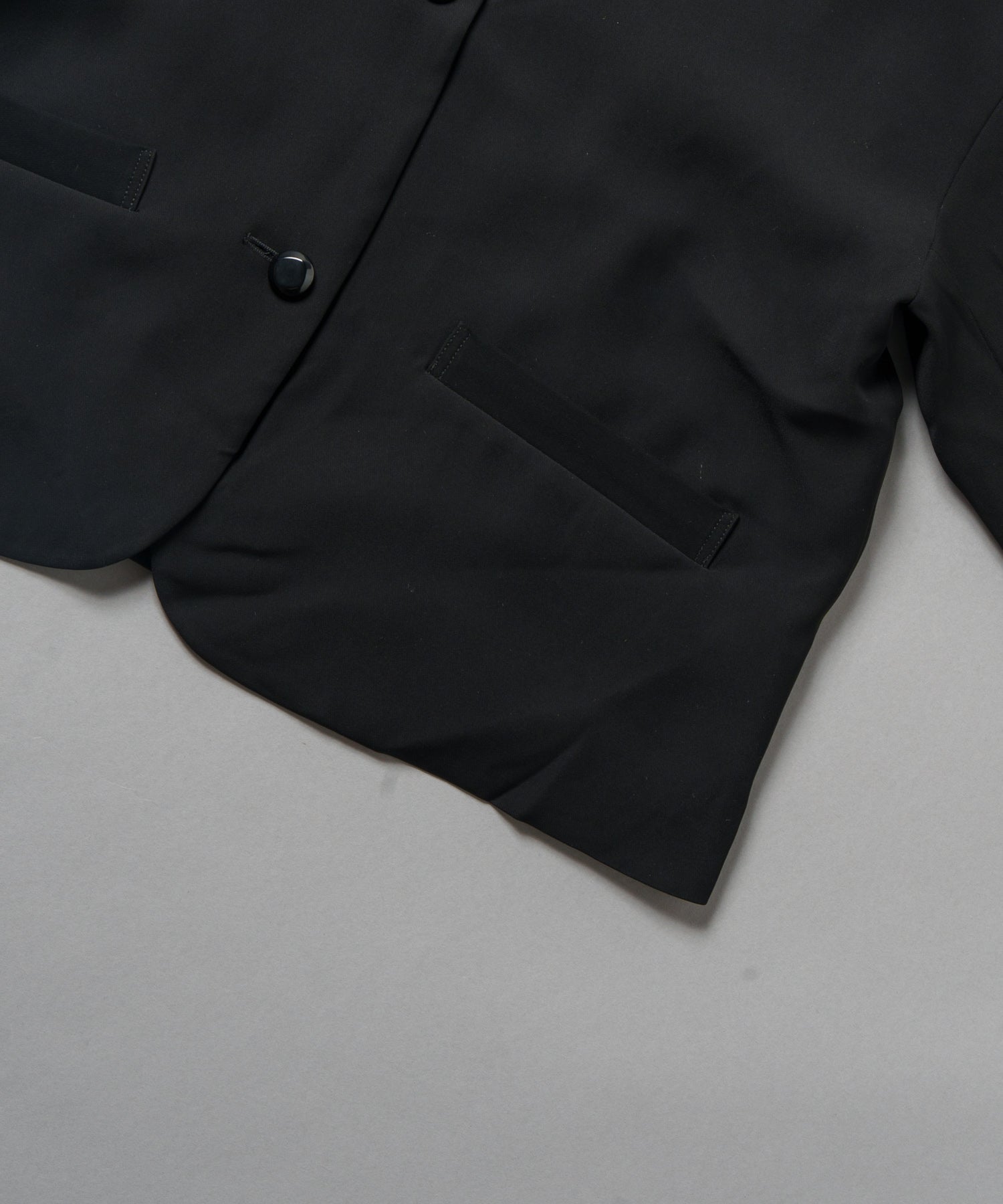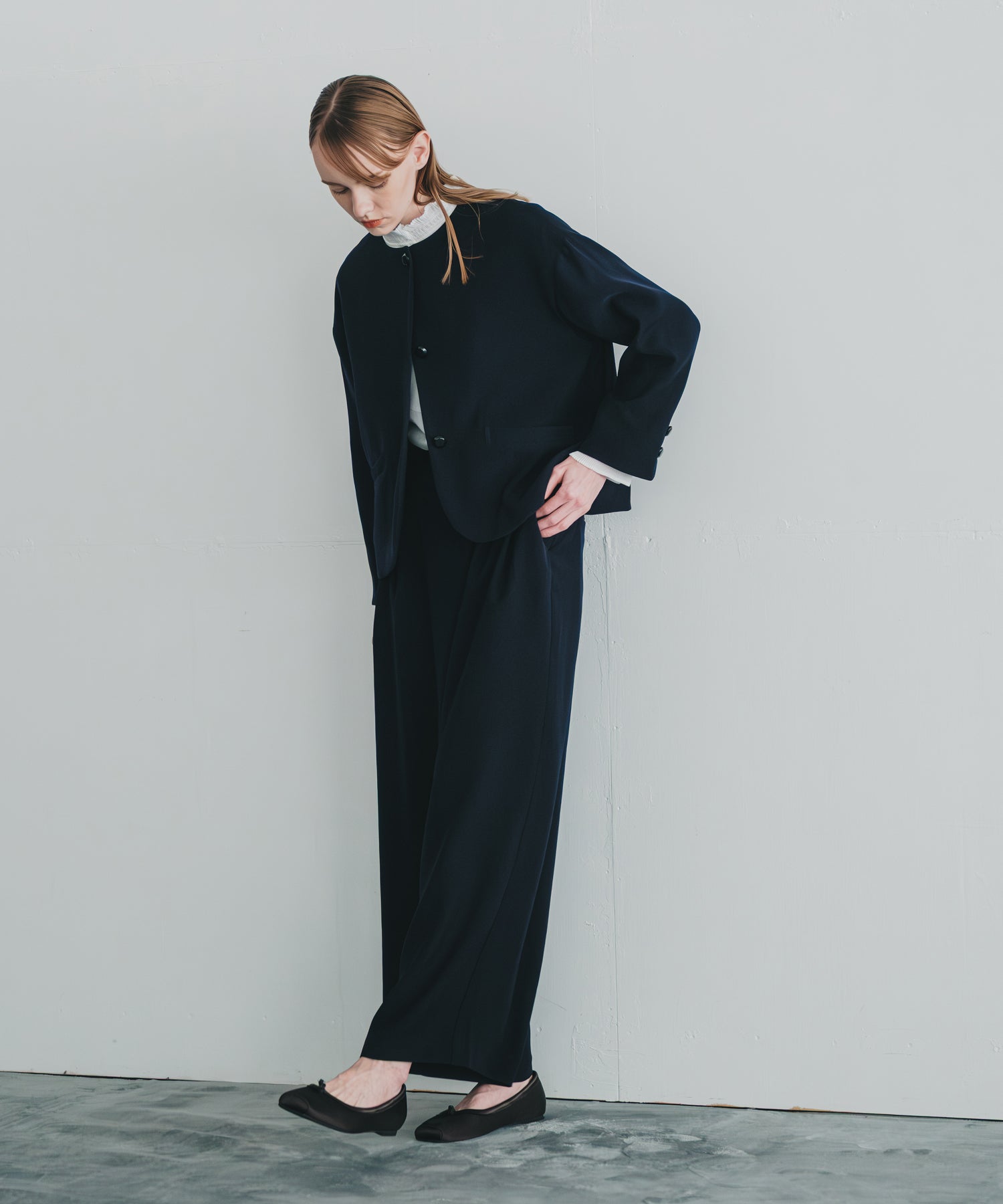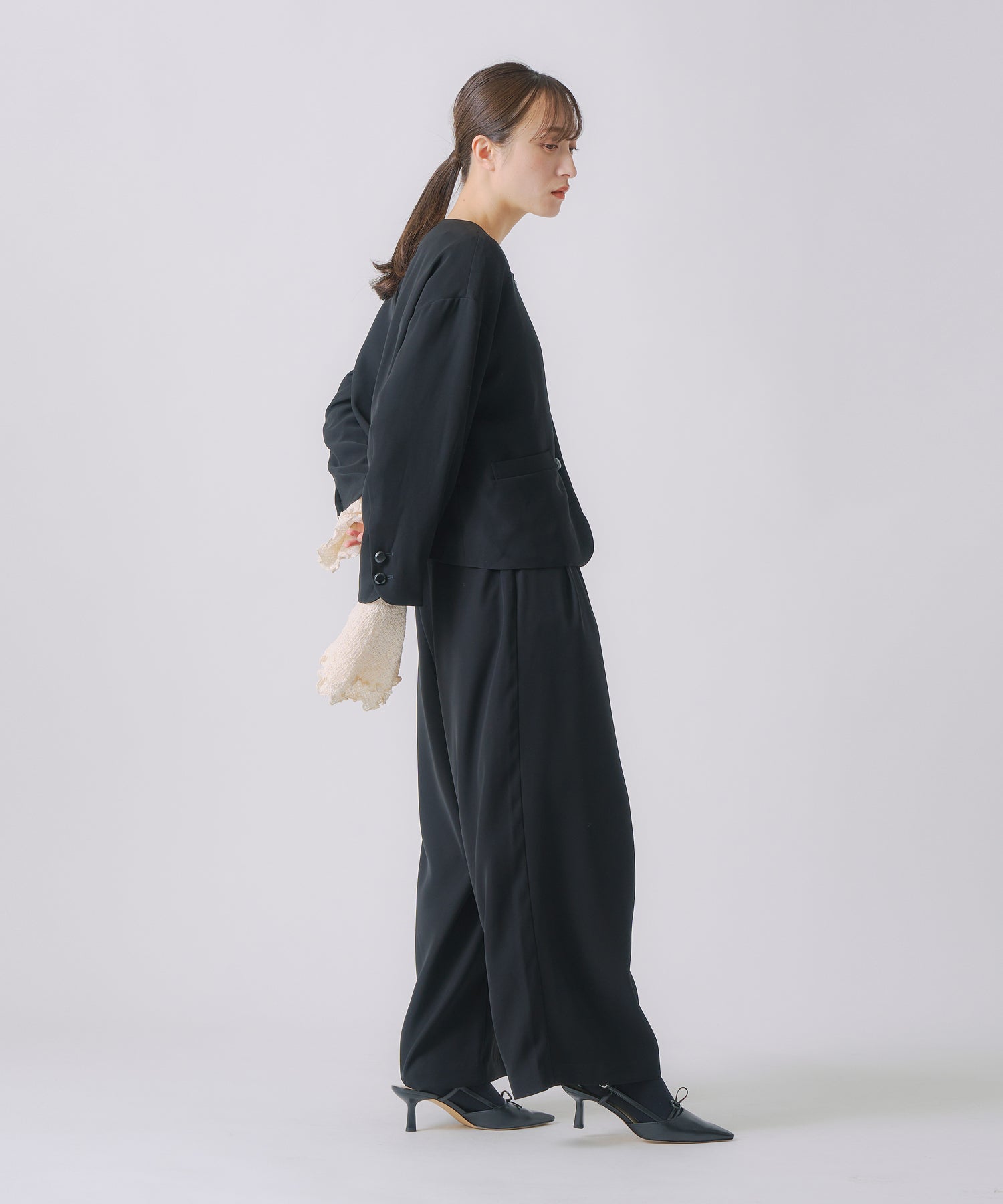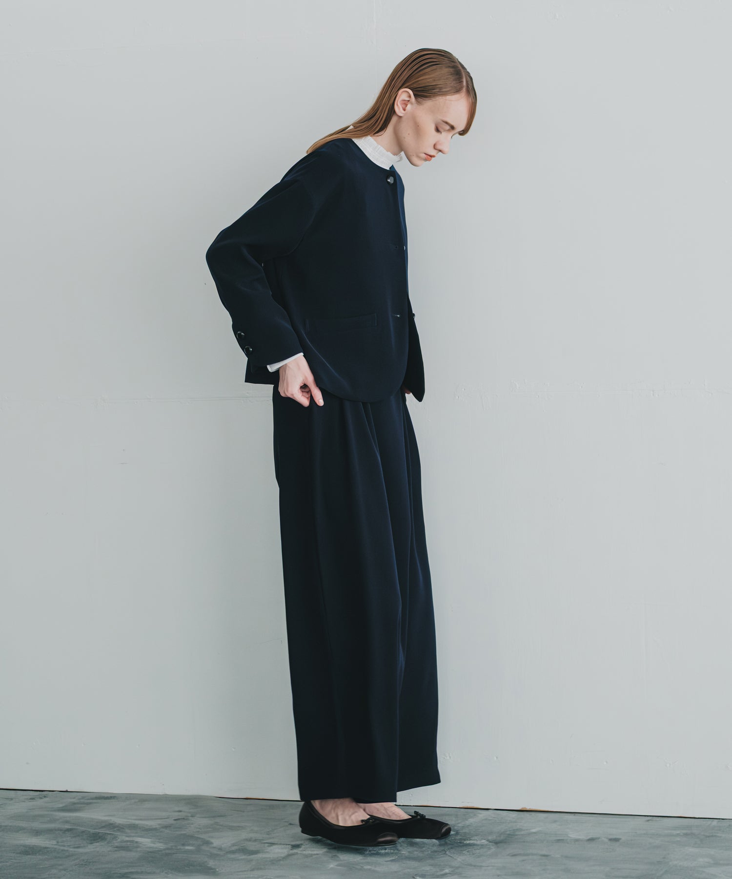 ノーカラーですっきりした印象を持たせながら、ヘムラインに丸みを帯びたラインを効かせたジャケットです。