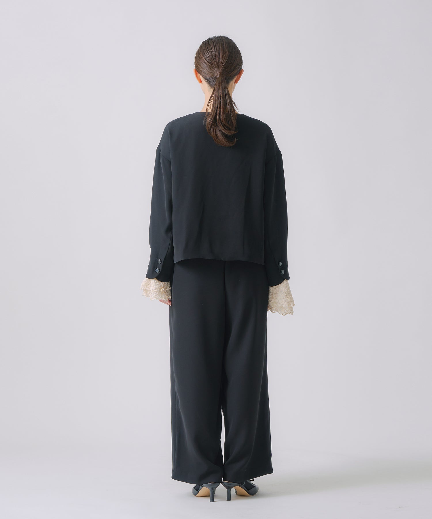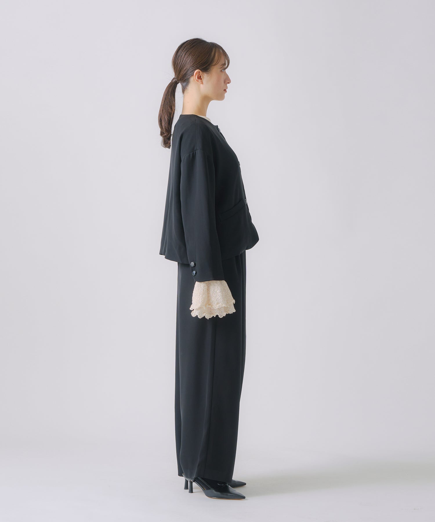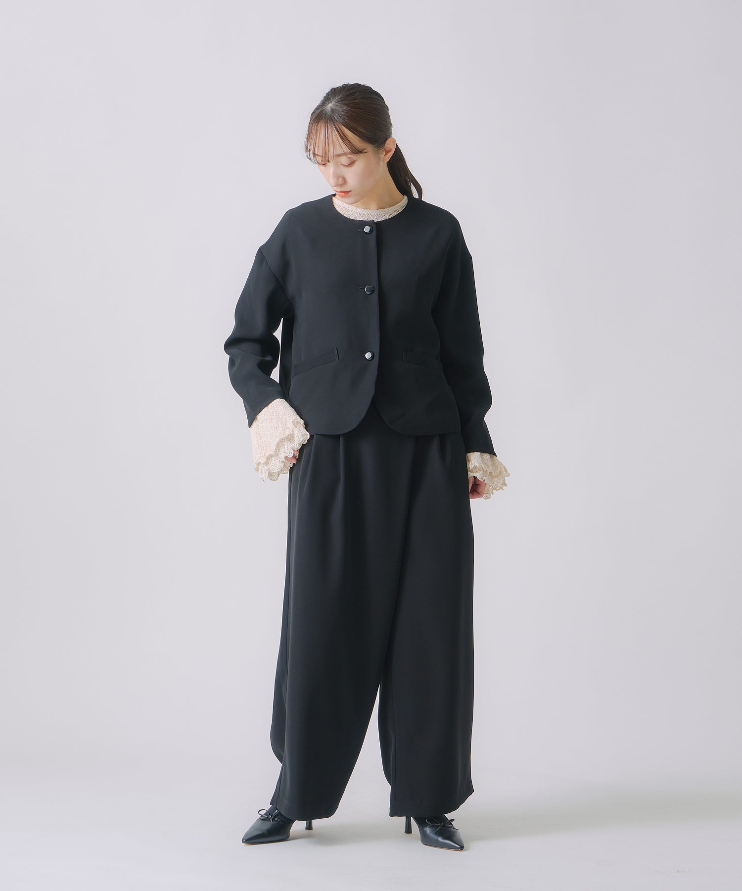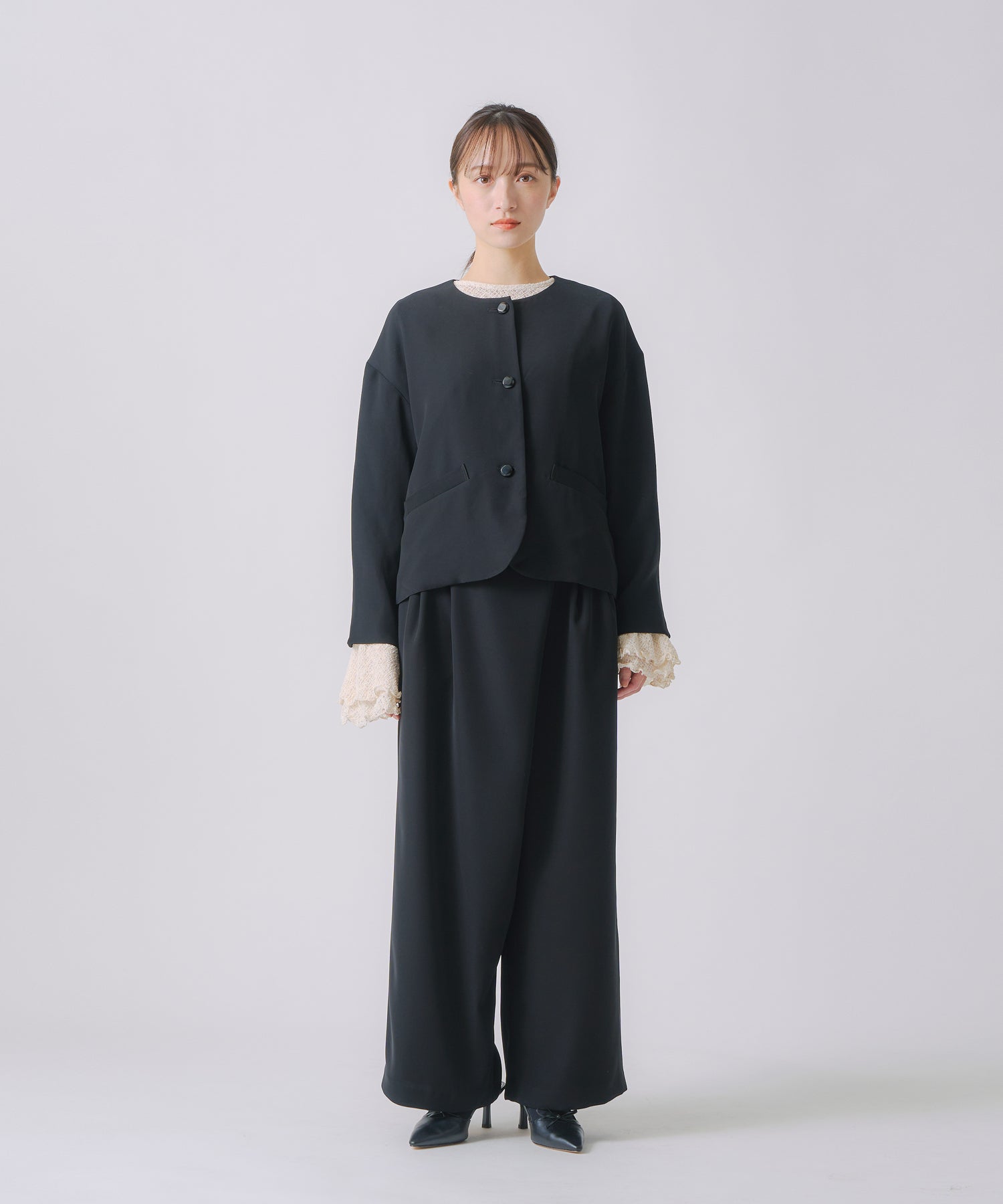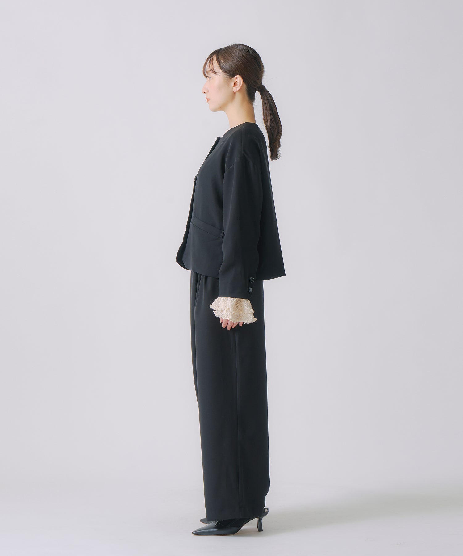 ノーカラーですっきりした印象を持たせながら、ヘムラインに丸みを帯びたラインを効かせたジャケットです。