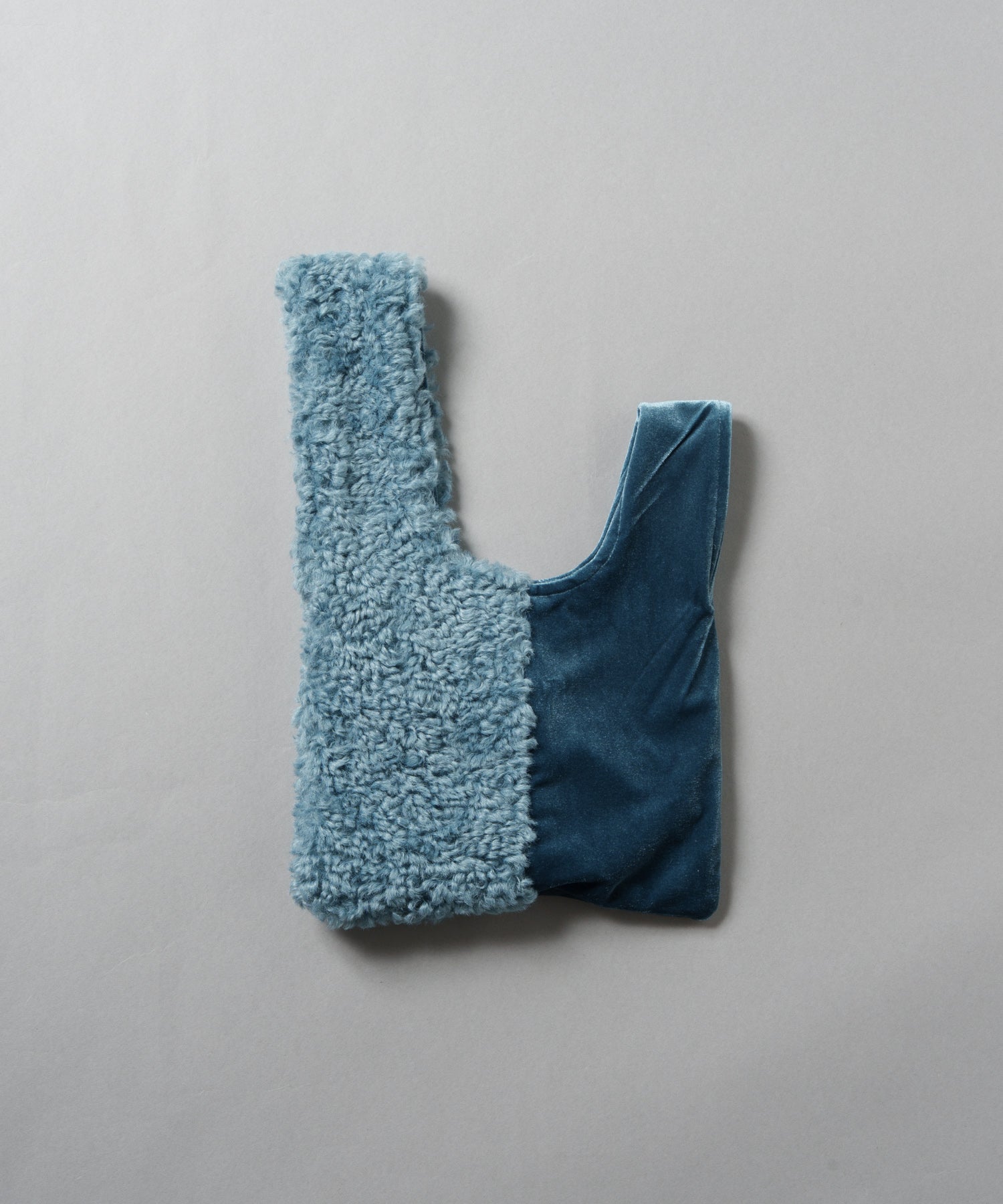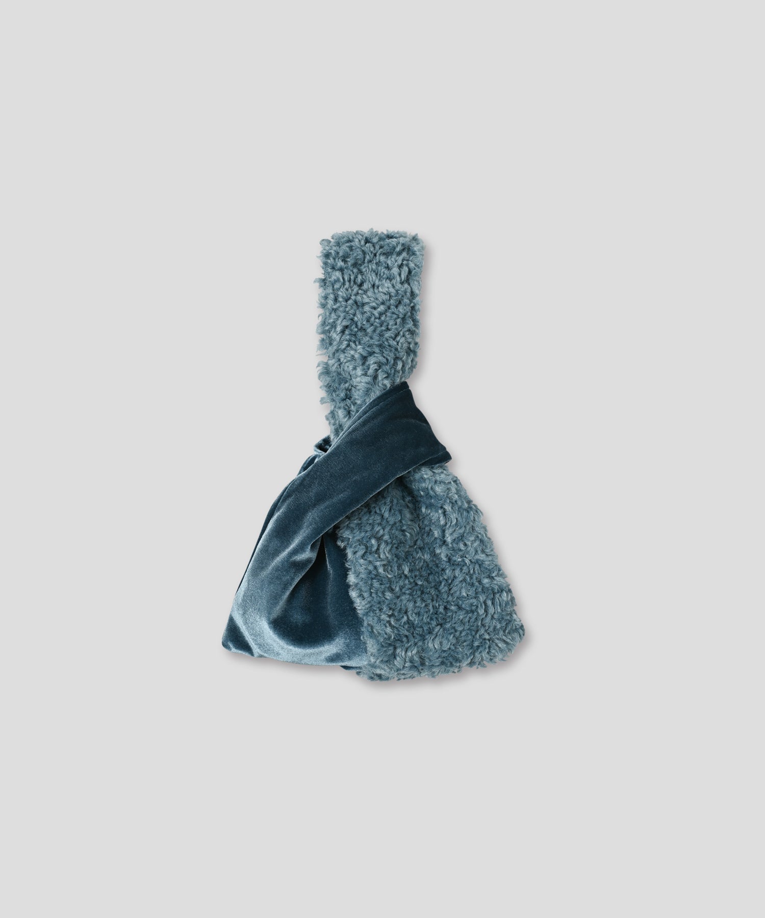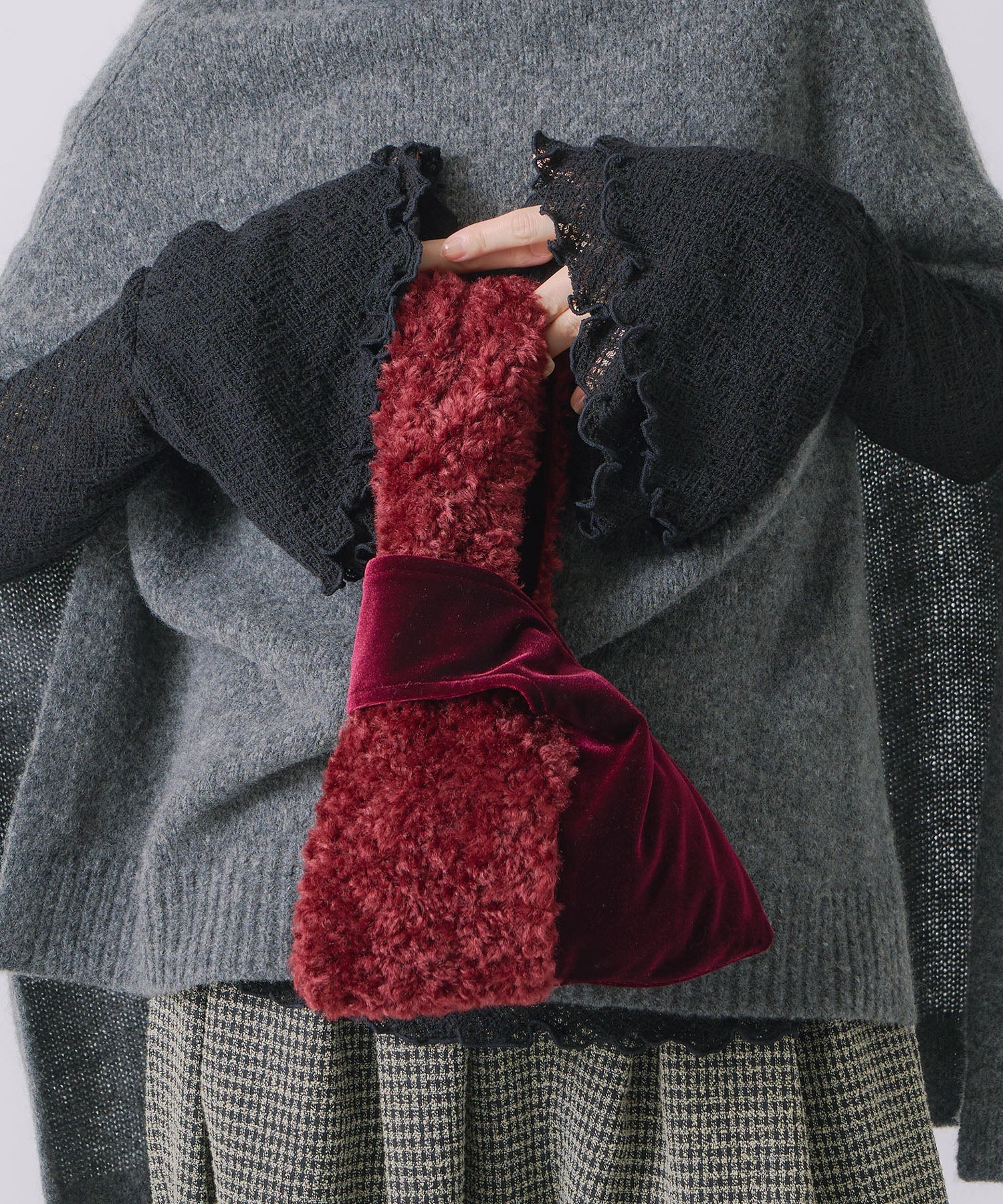 取っ手をもう片方の取っ手にくぐらせて持つアシンメトリーなバックで、ファーとベロアの素材感の対比も印象的です。