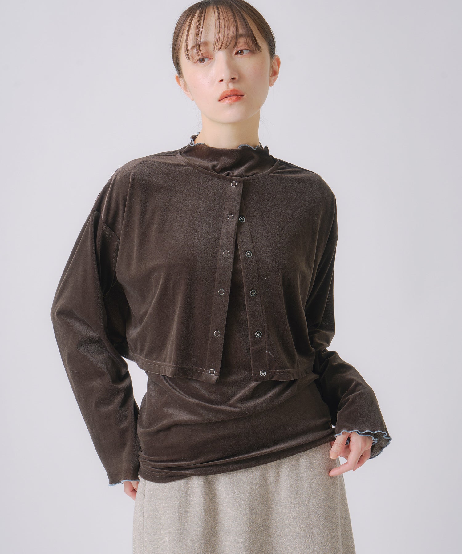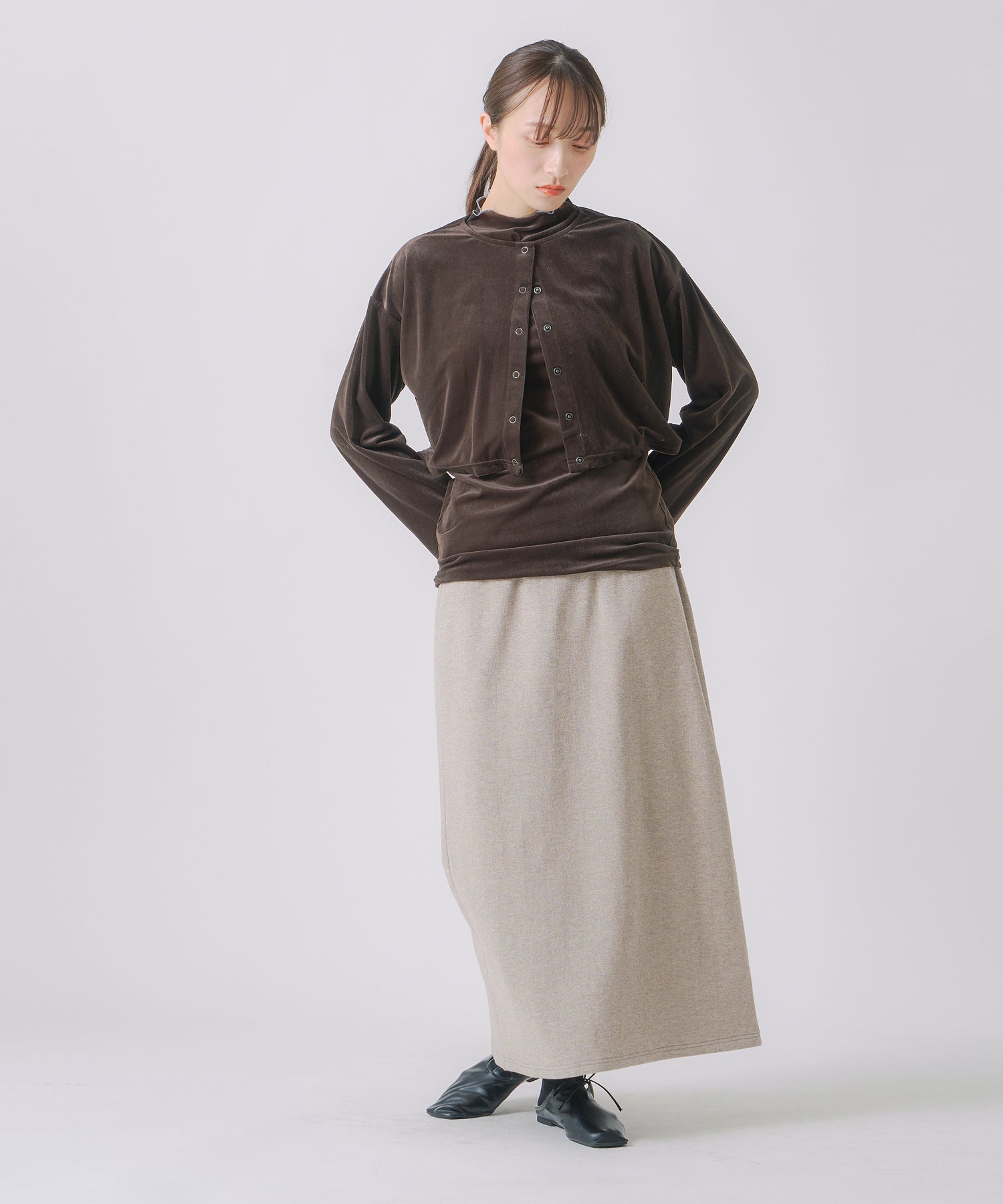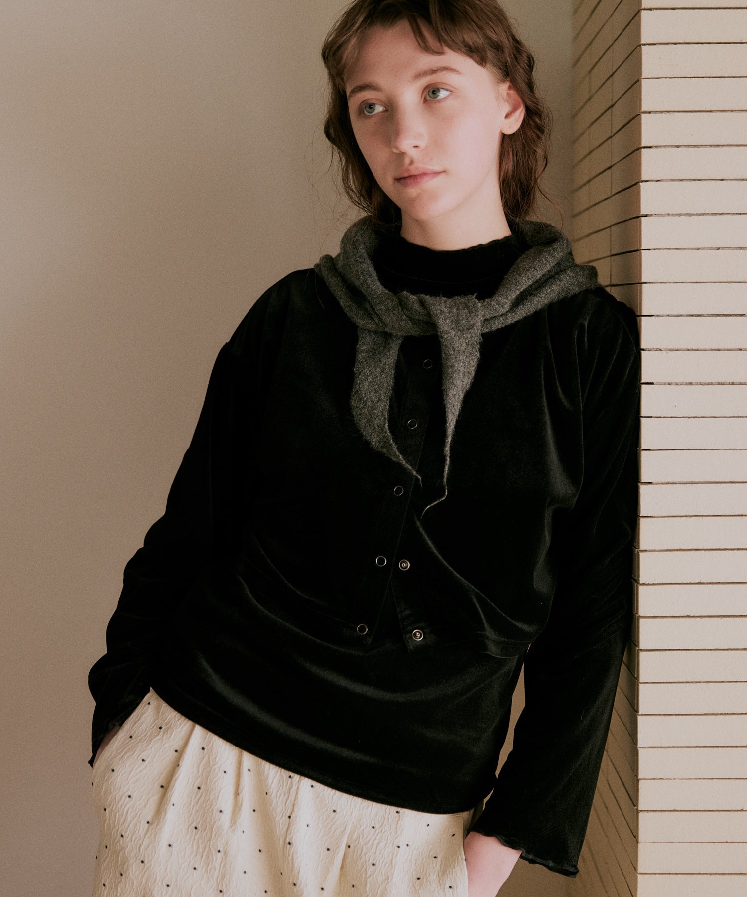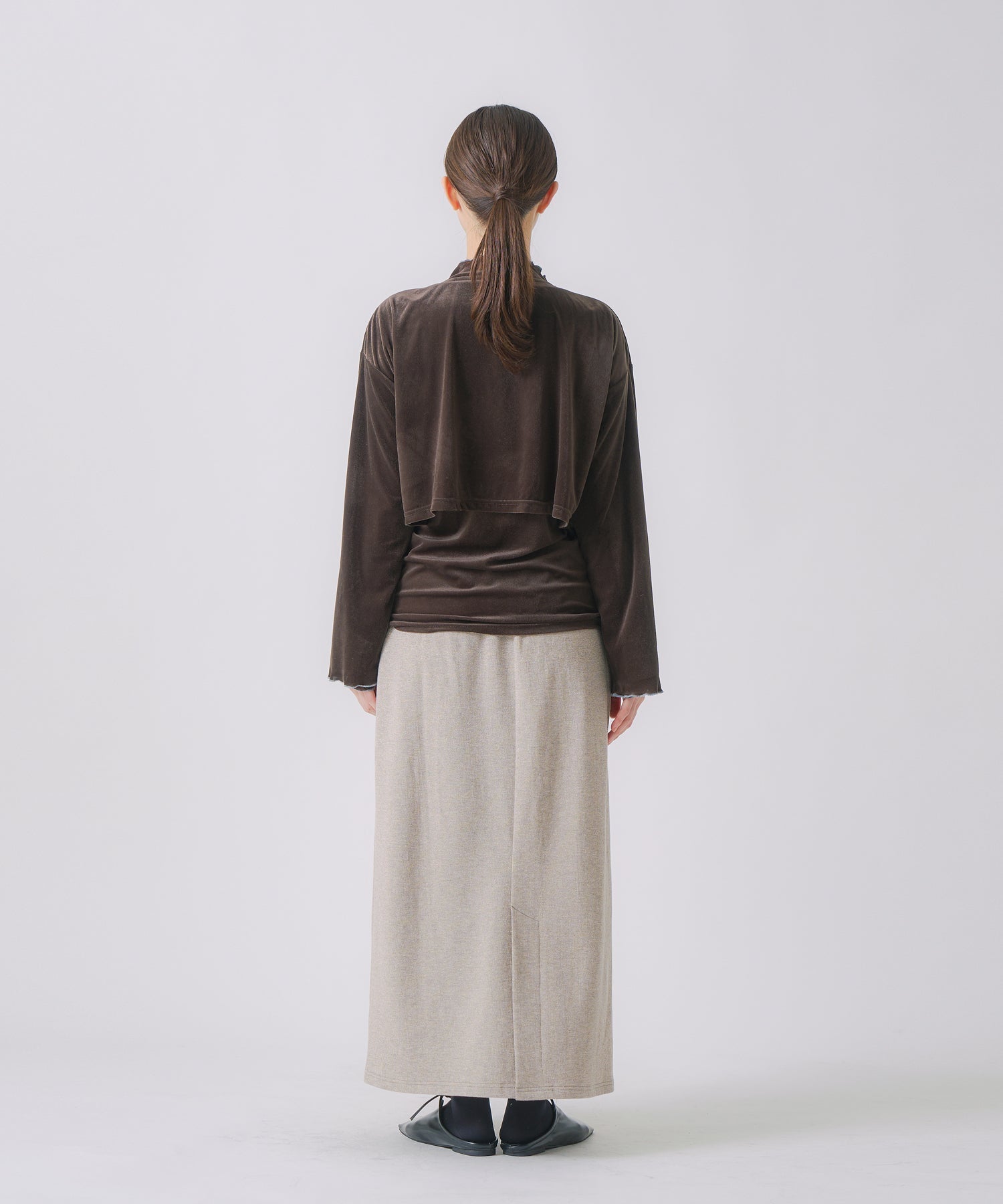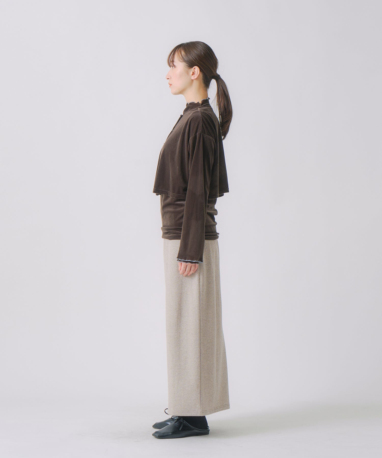 同素材展開のベロアトップスとのレイヤードはもちろん、ワンピースやサロペットなどお手持ちのアイテムとのスタイリング可能です。