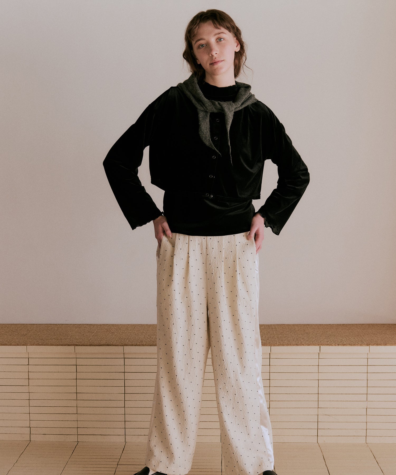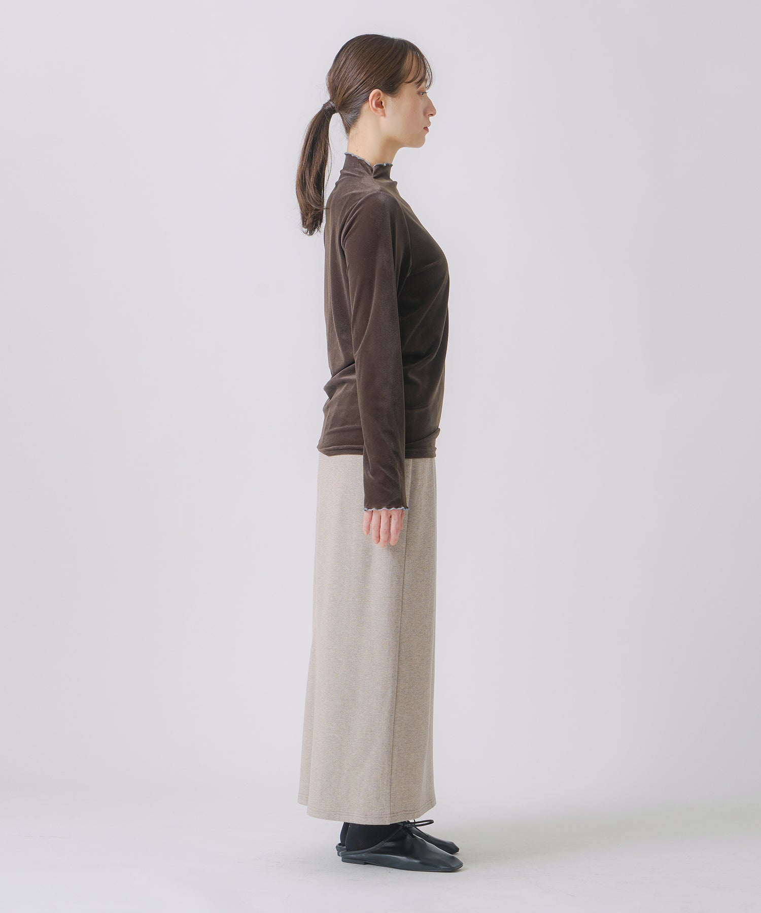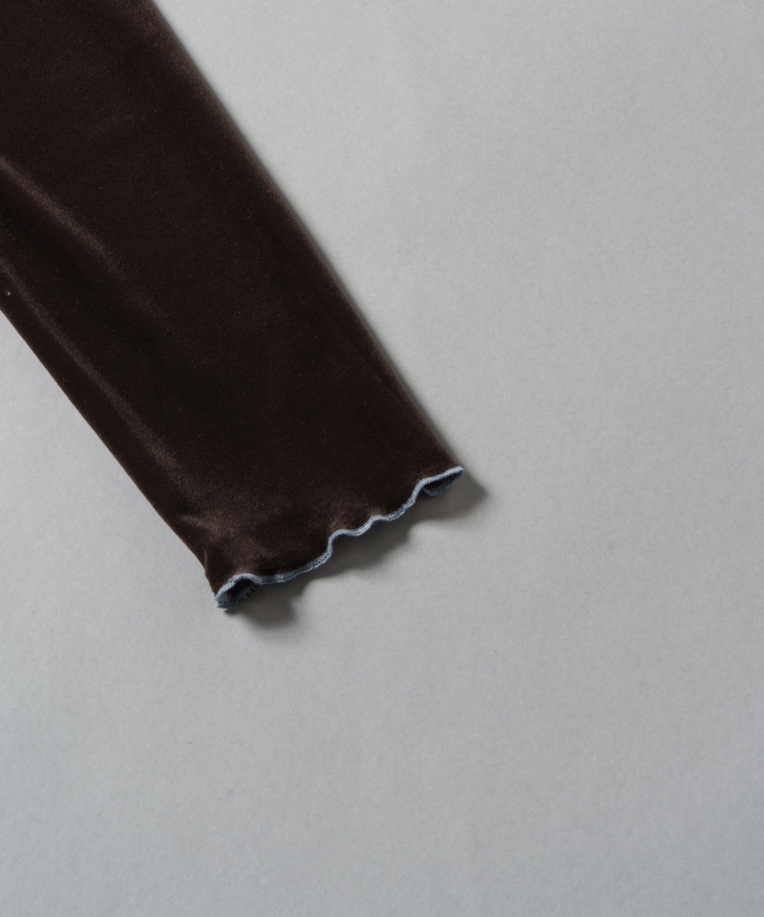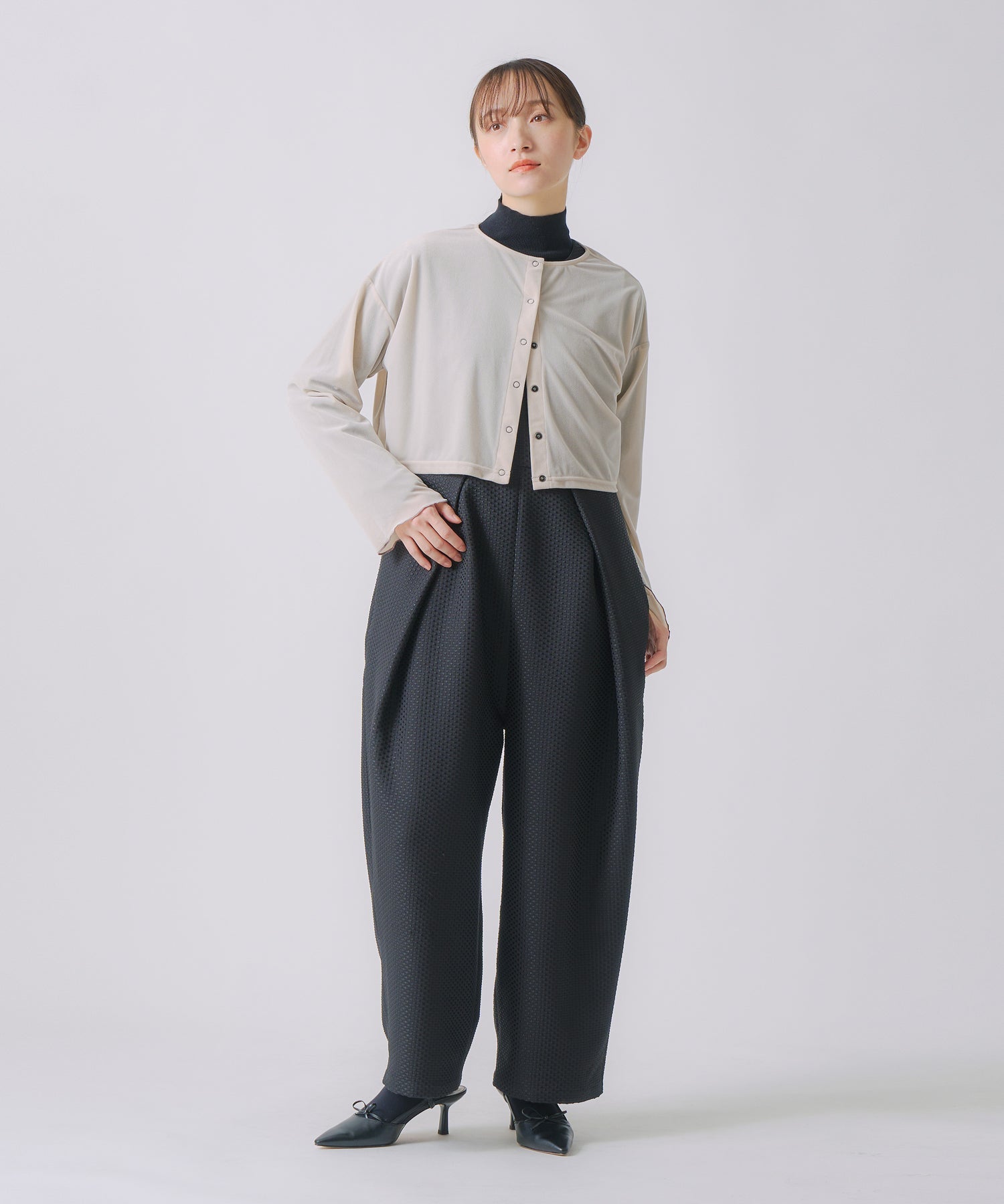 同素材展開のベロアトップスとのレイヤードはもちろん、ワンピースやサロペットなどお手持ちのアイテムとのスタイリング可能です。