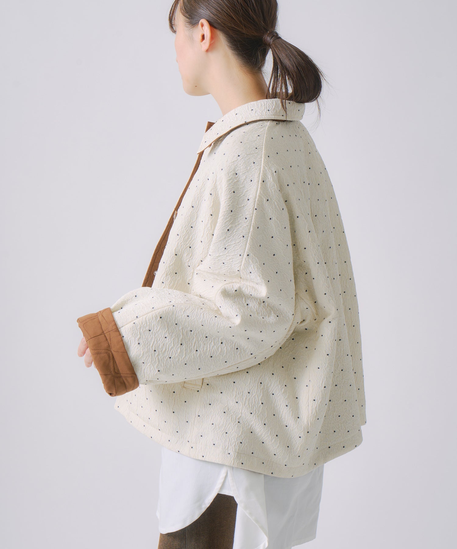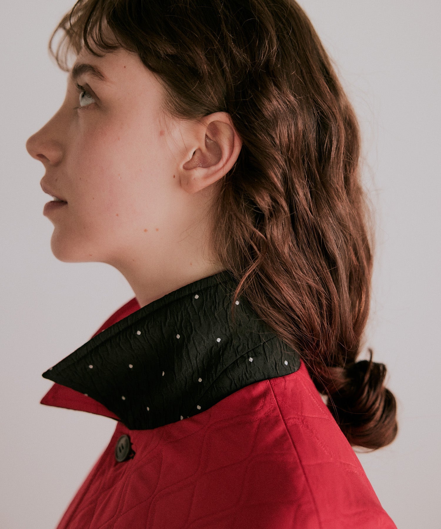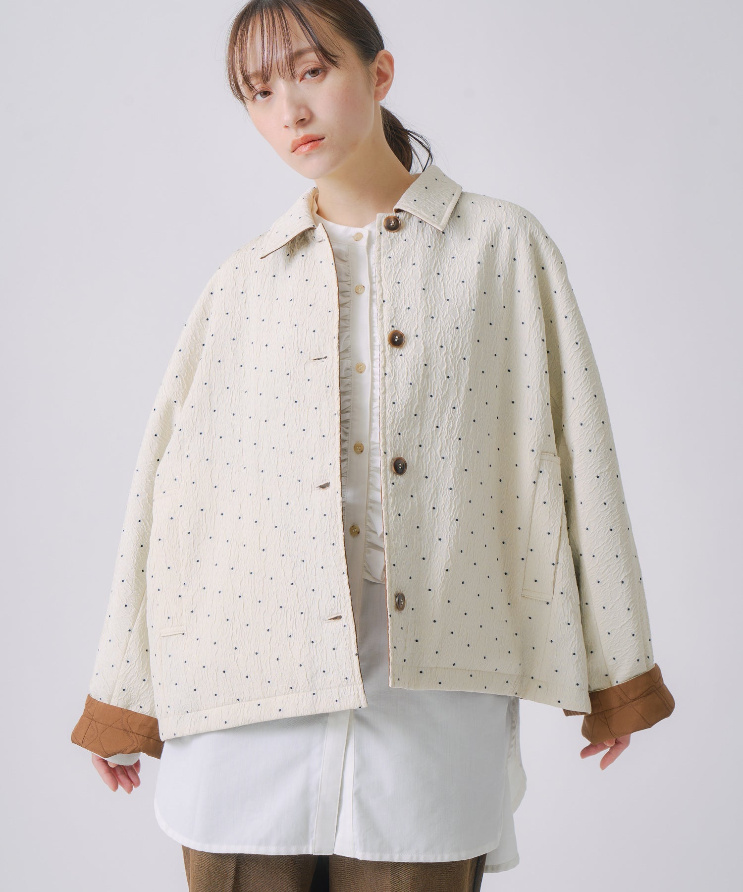 ドット柄とアクセントカラーが目を引く、リバーシブルのキルトジャケットです。