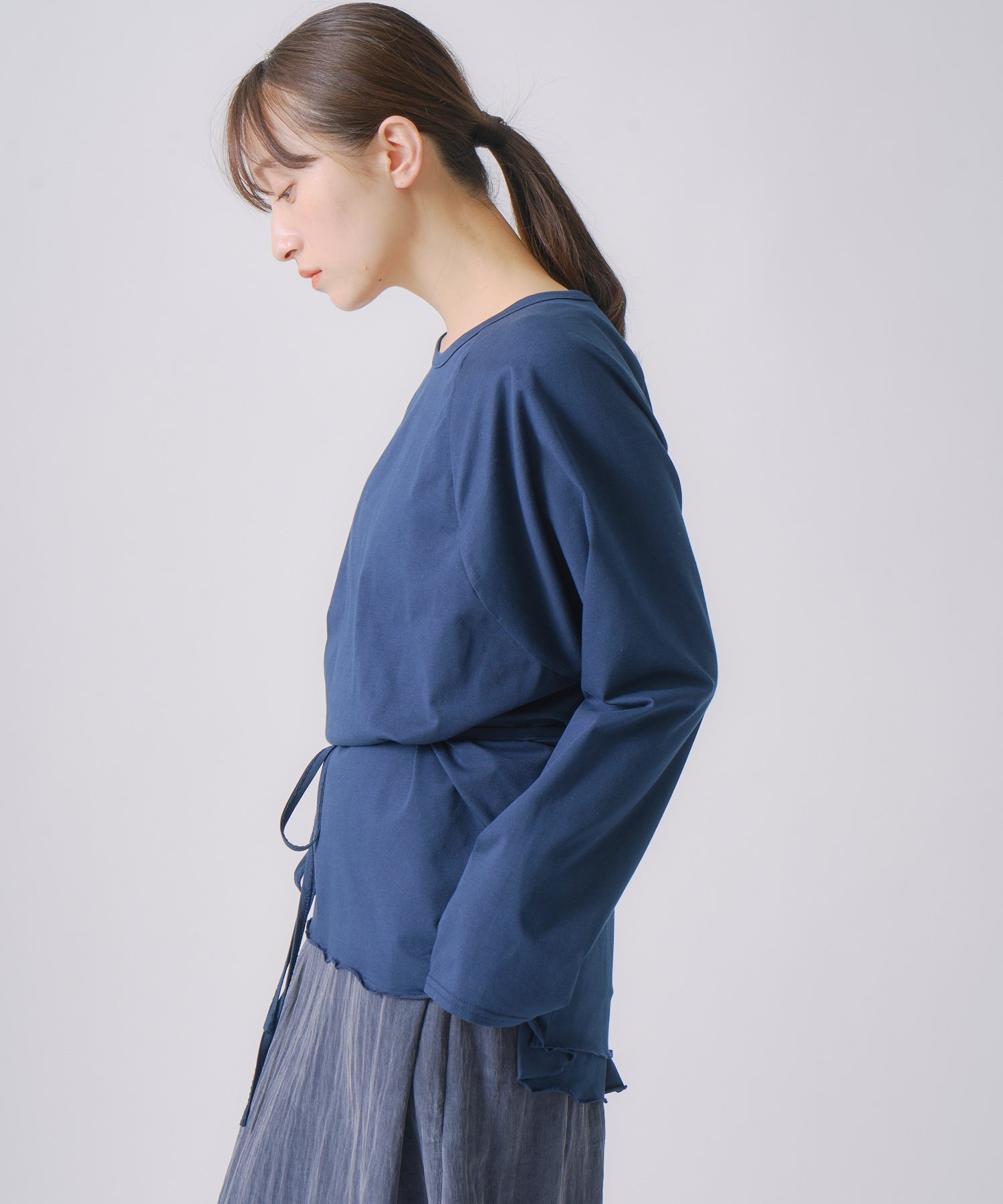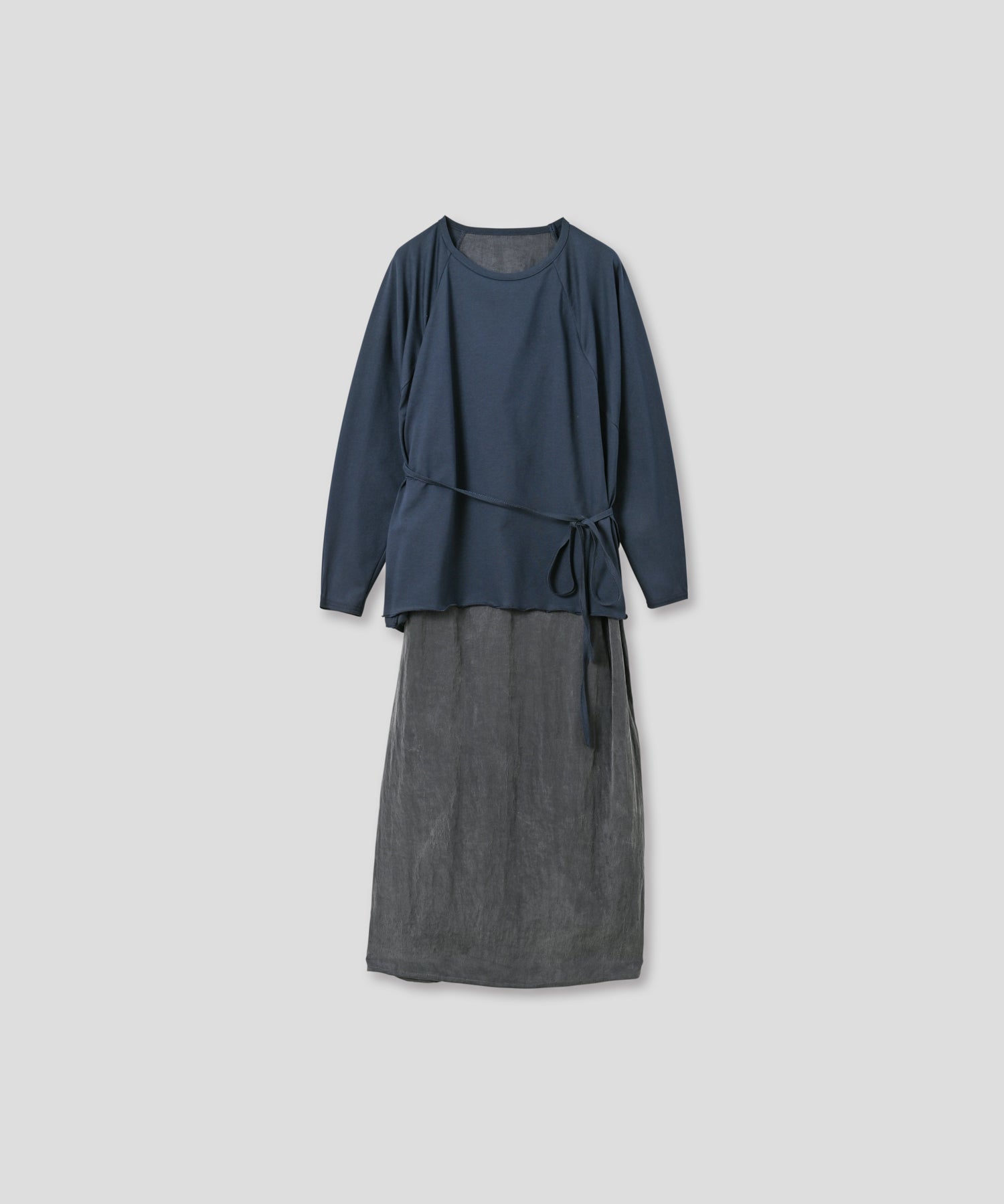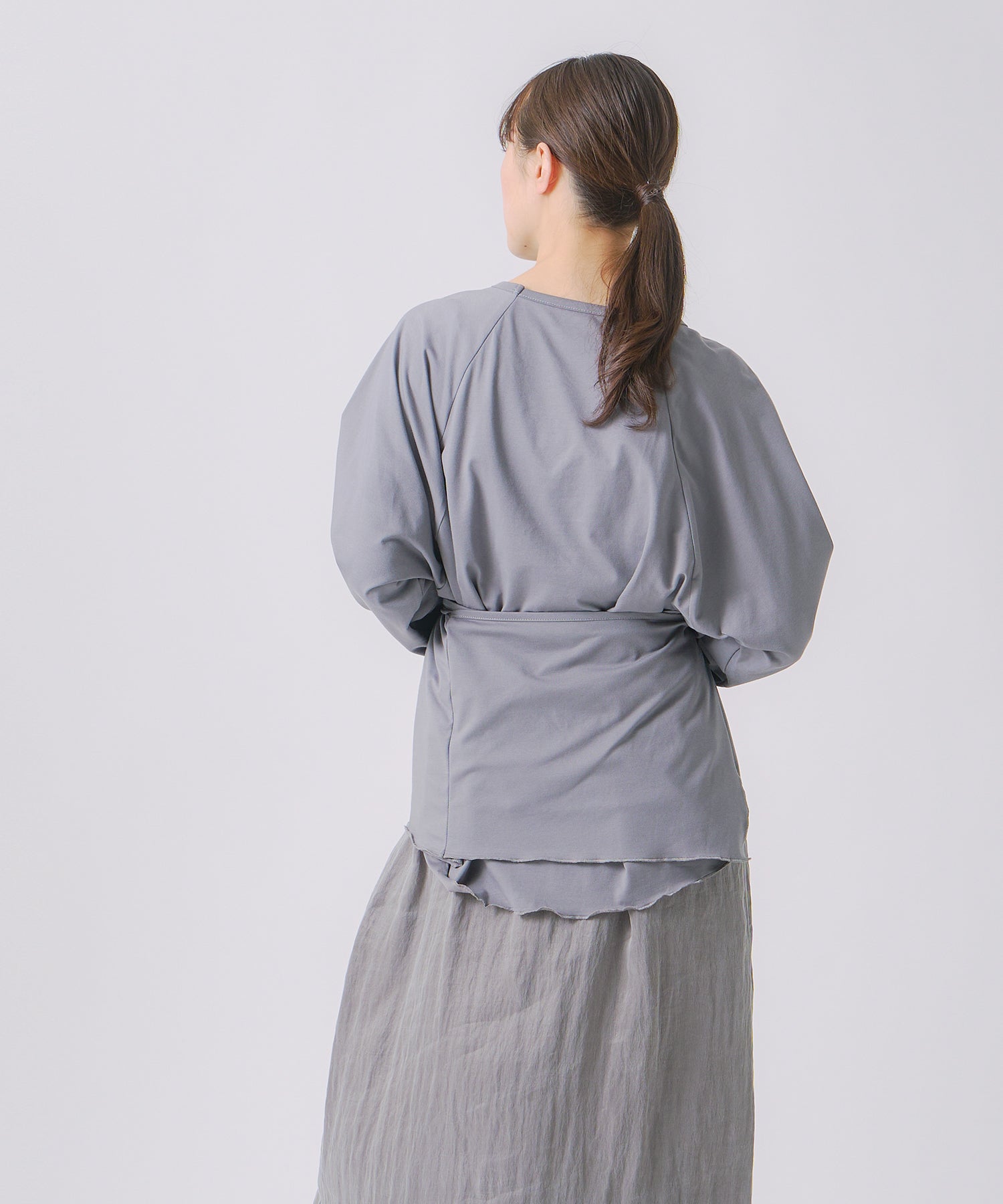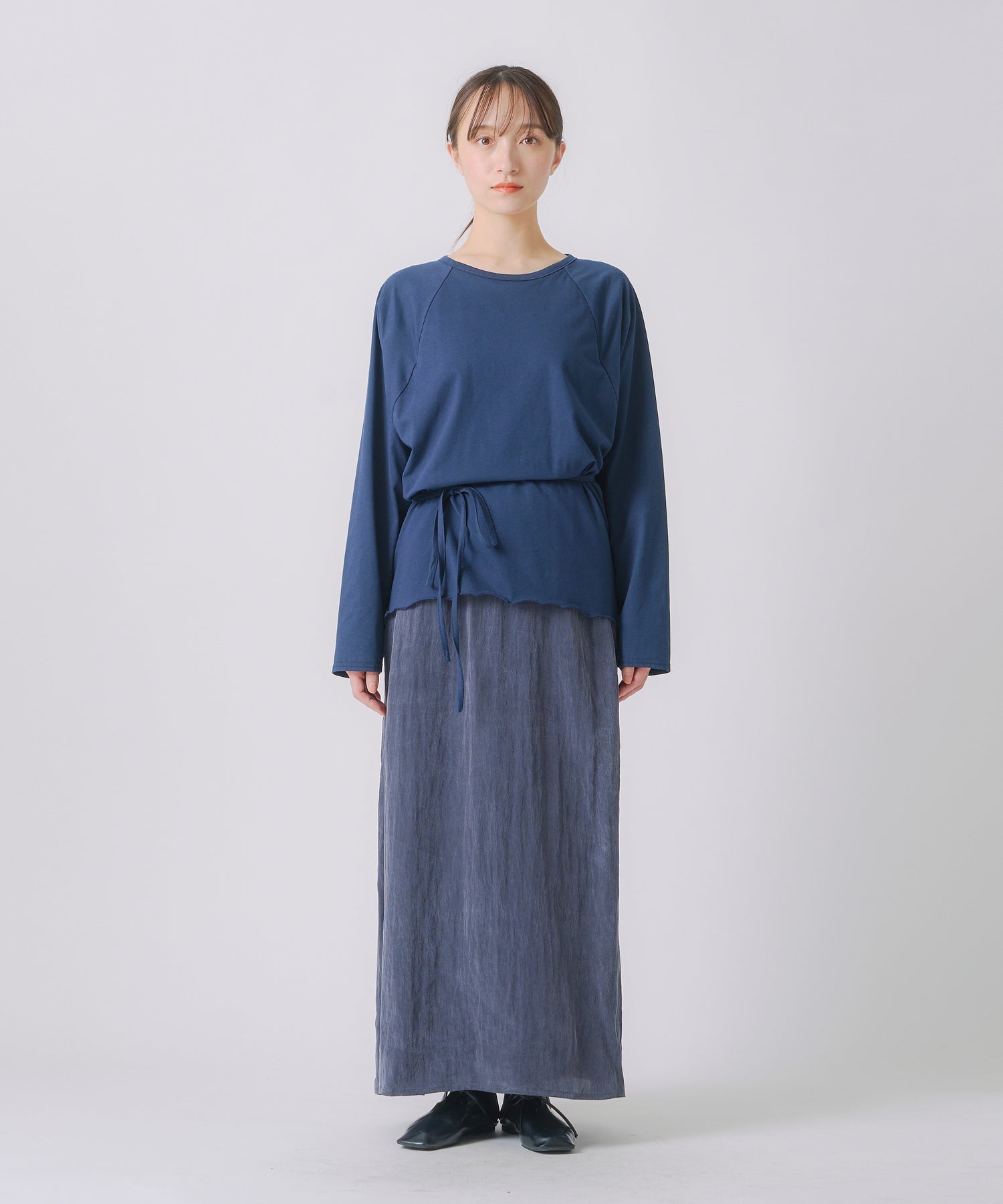 全体的にゆったりとしたサイジングで、エプロンパーツをウエストに巻いてブラウジングさせたり、お好みで巻き方を調整していただけます。