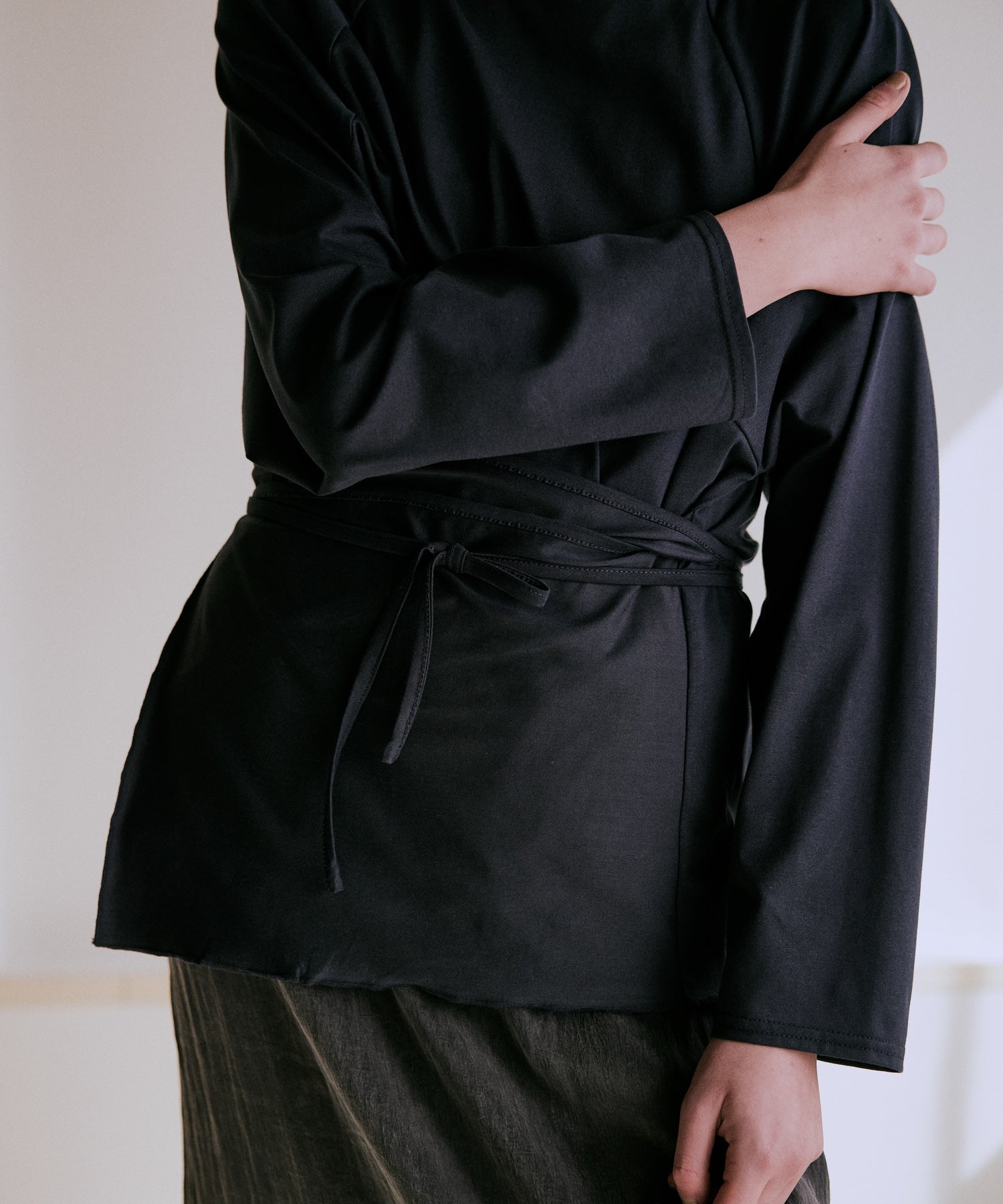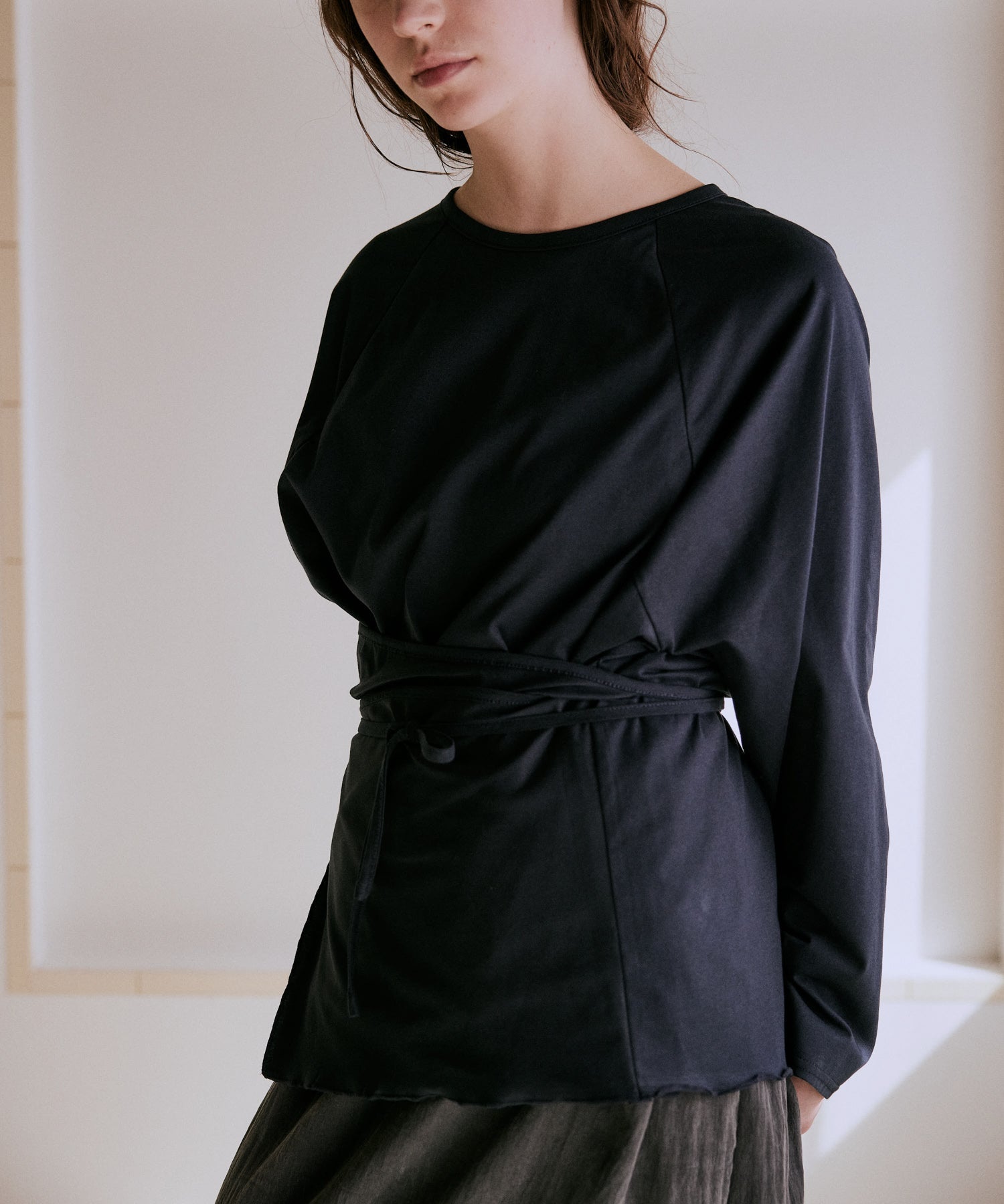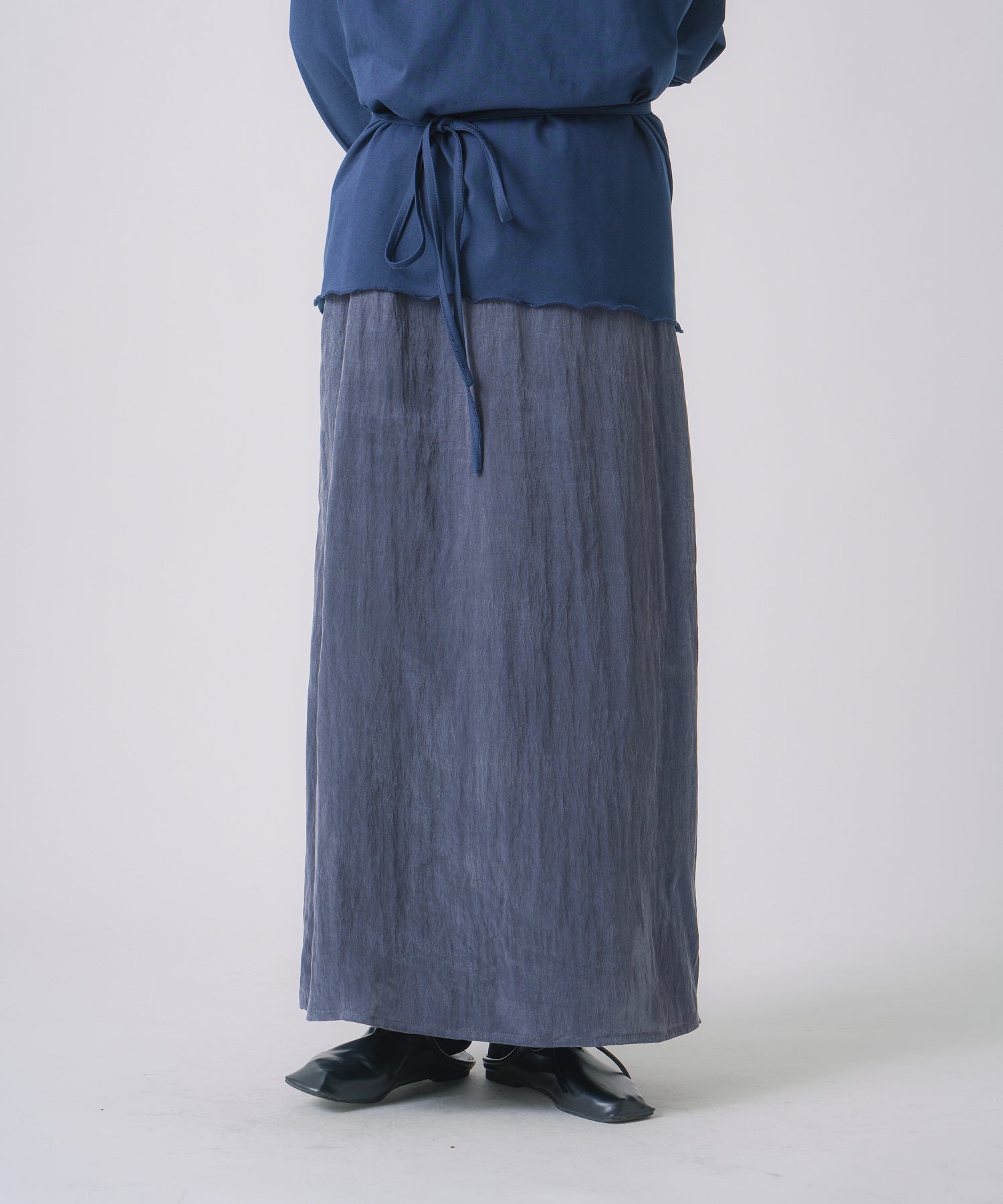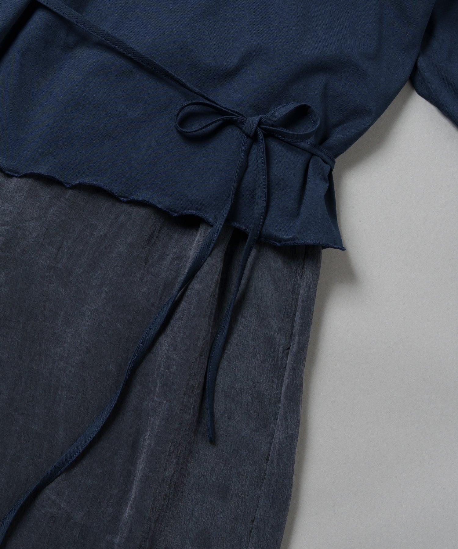 全体的にゆったりとしたサイジングで、エプロンパーツをウエストに巻いてブラウジングさせたり、お好みで巻き方を調整していただけます。