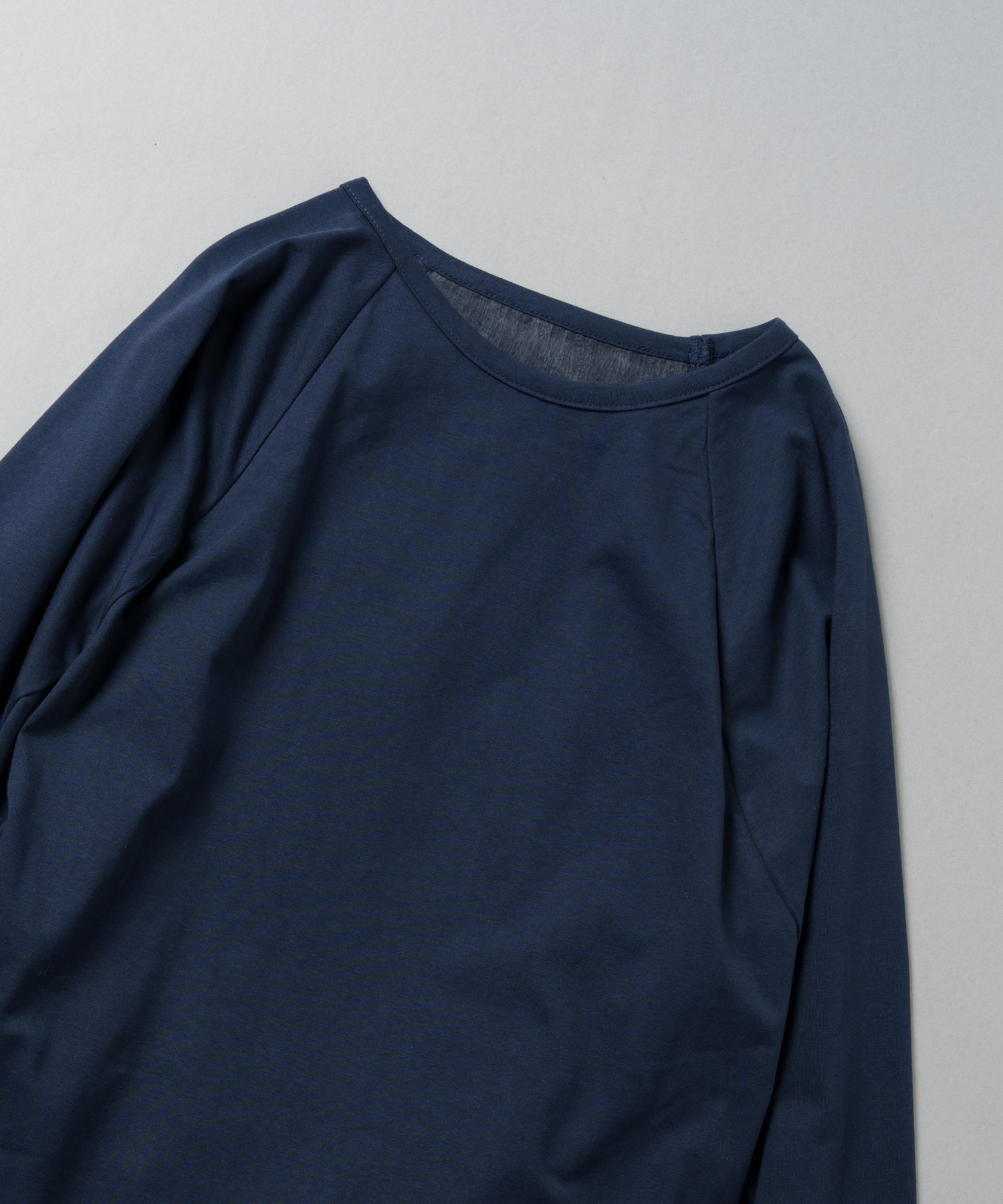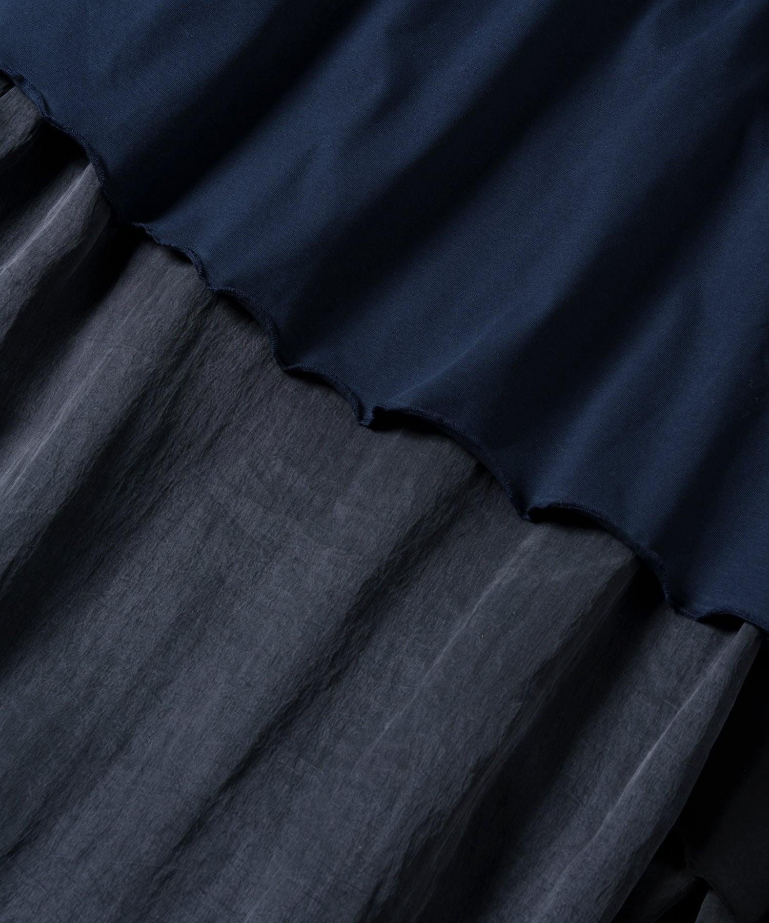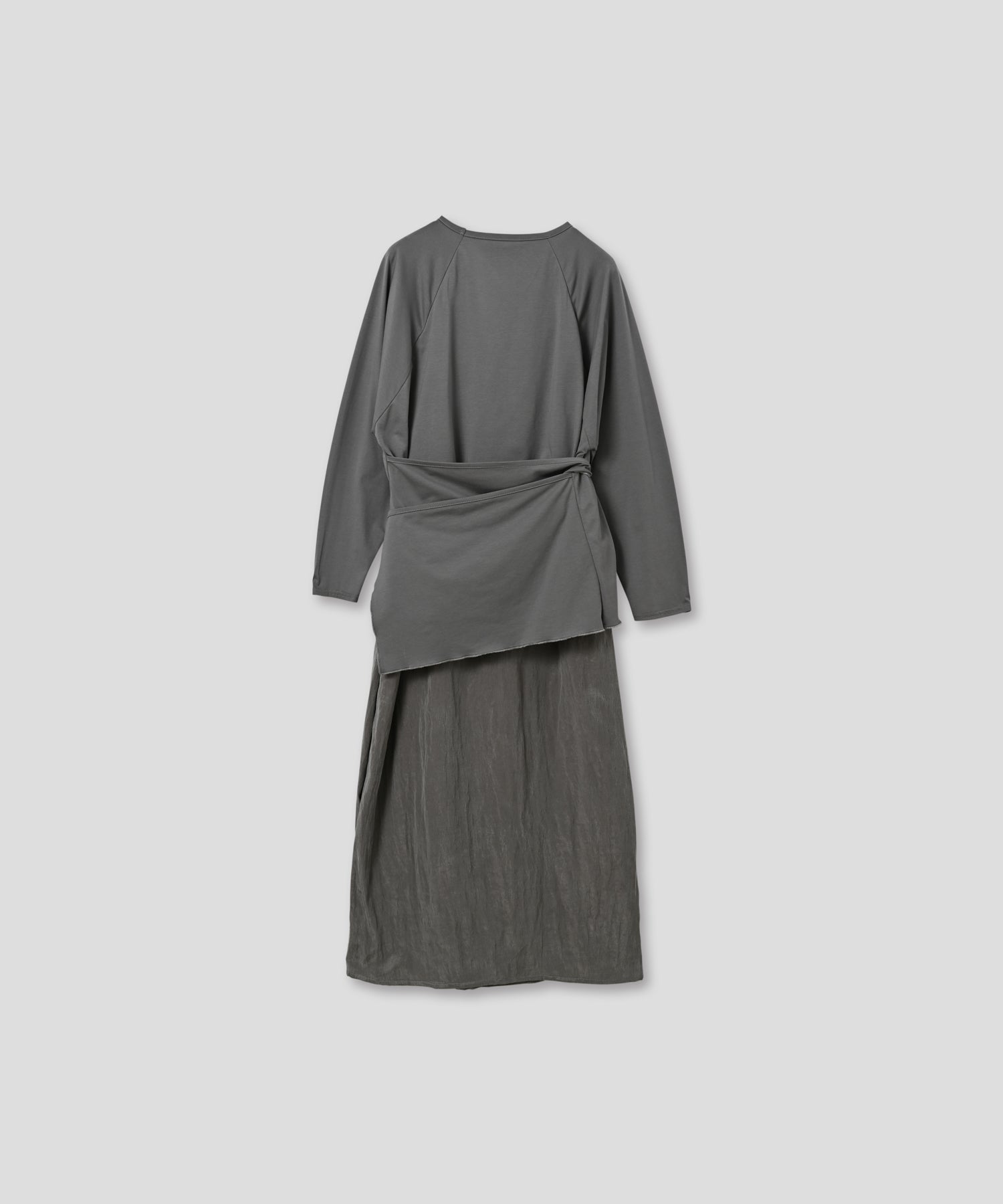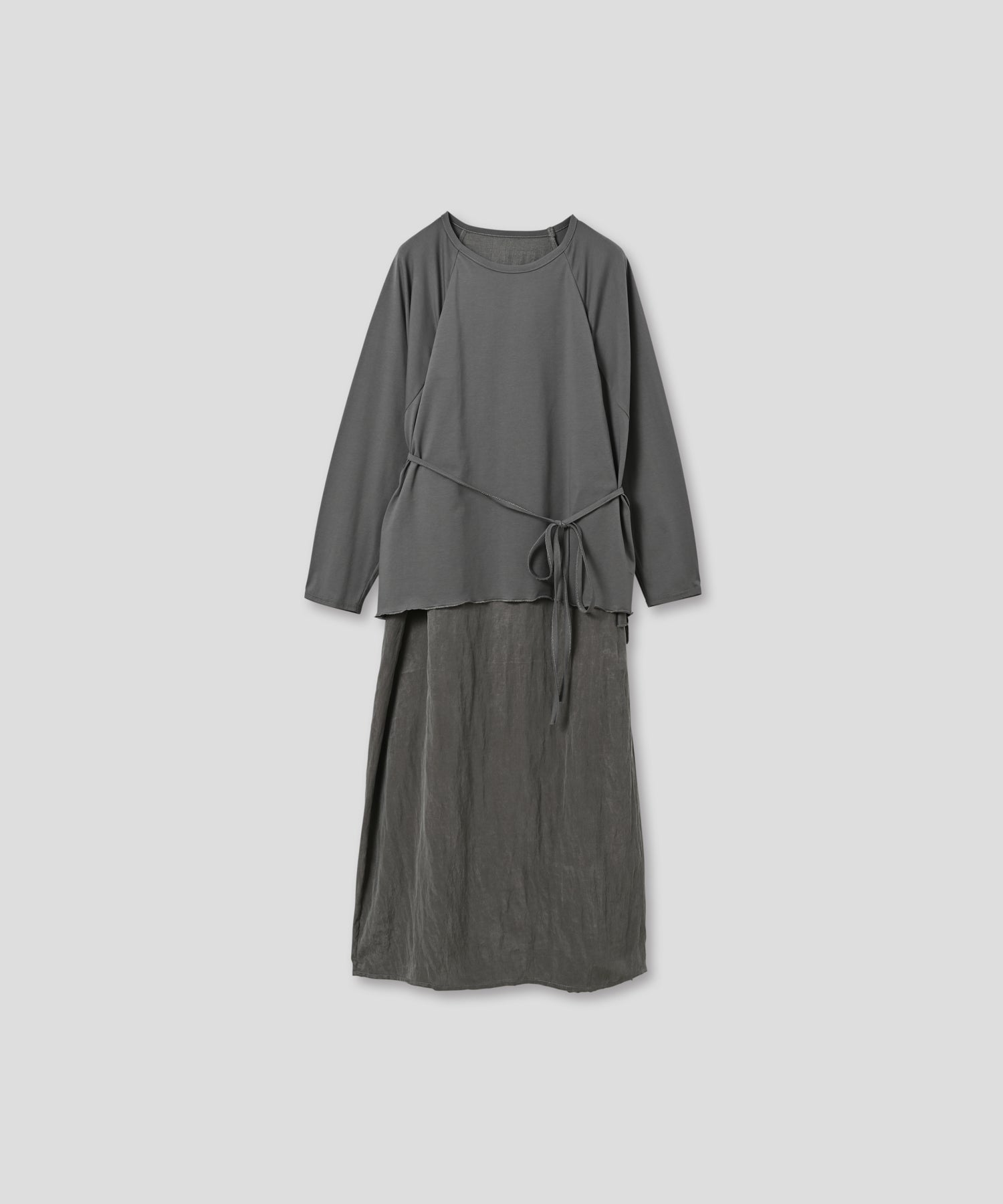 トップス部分にはカットソー素材を使用し、スカート部分にはピーチ起毛素材を使用し、メリハリのある異素材コンビに仕上げています。