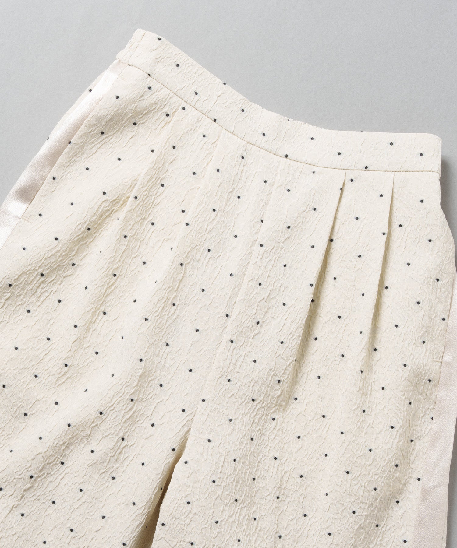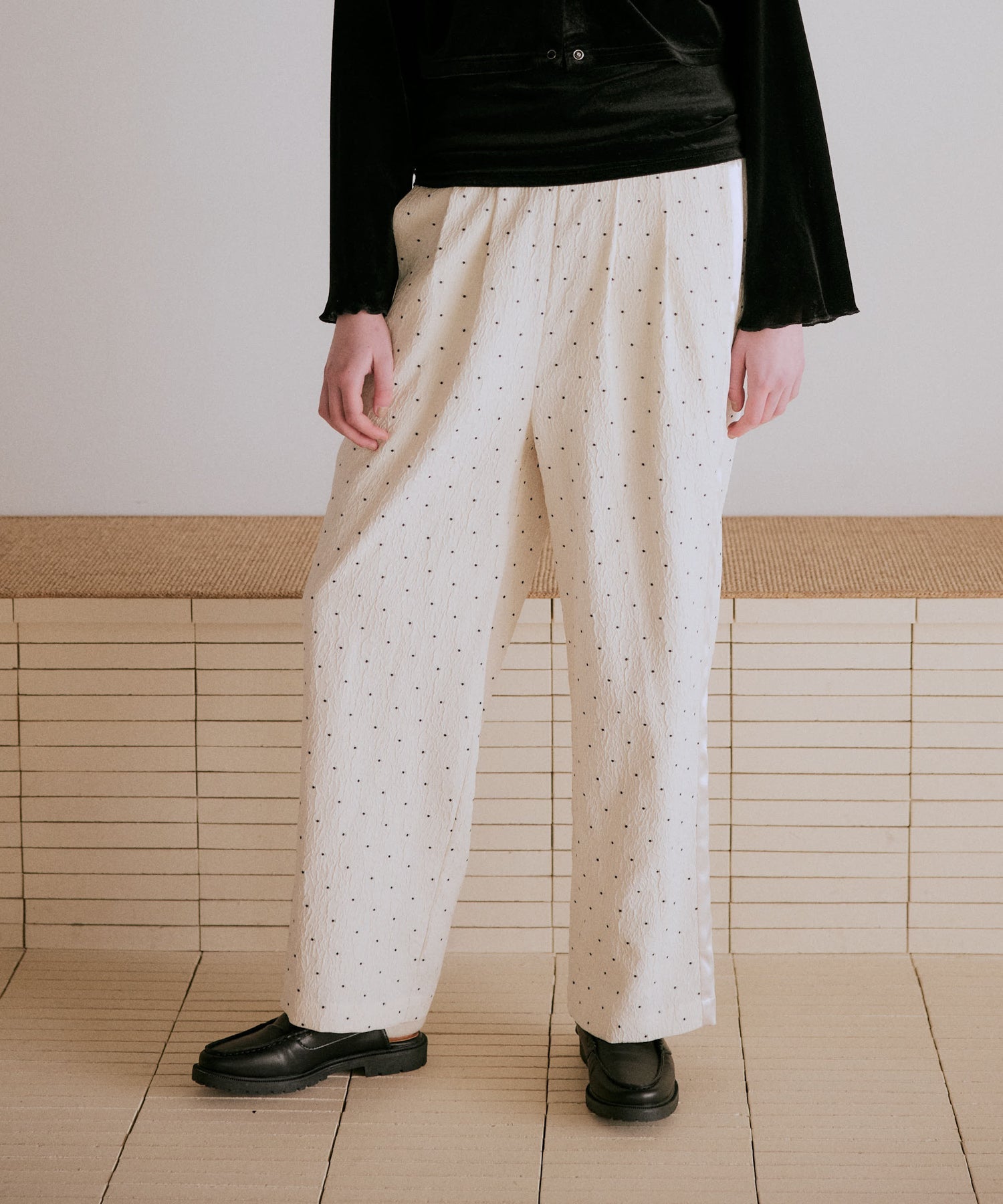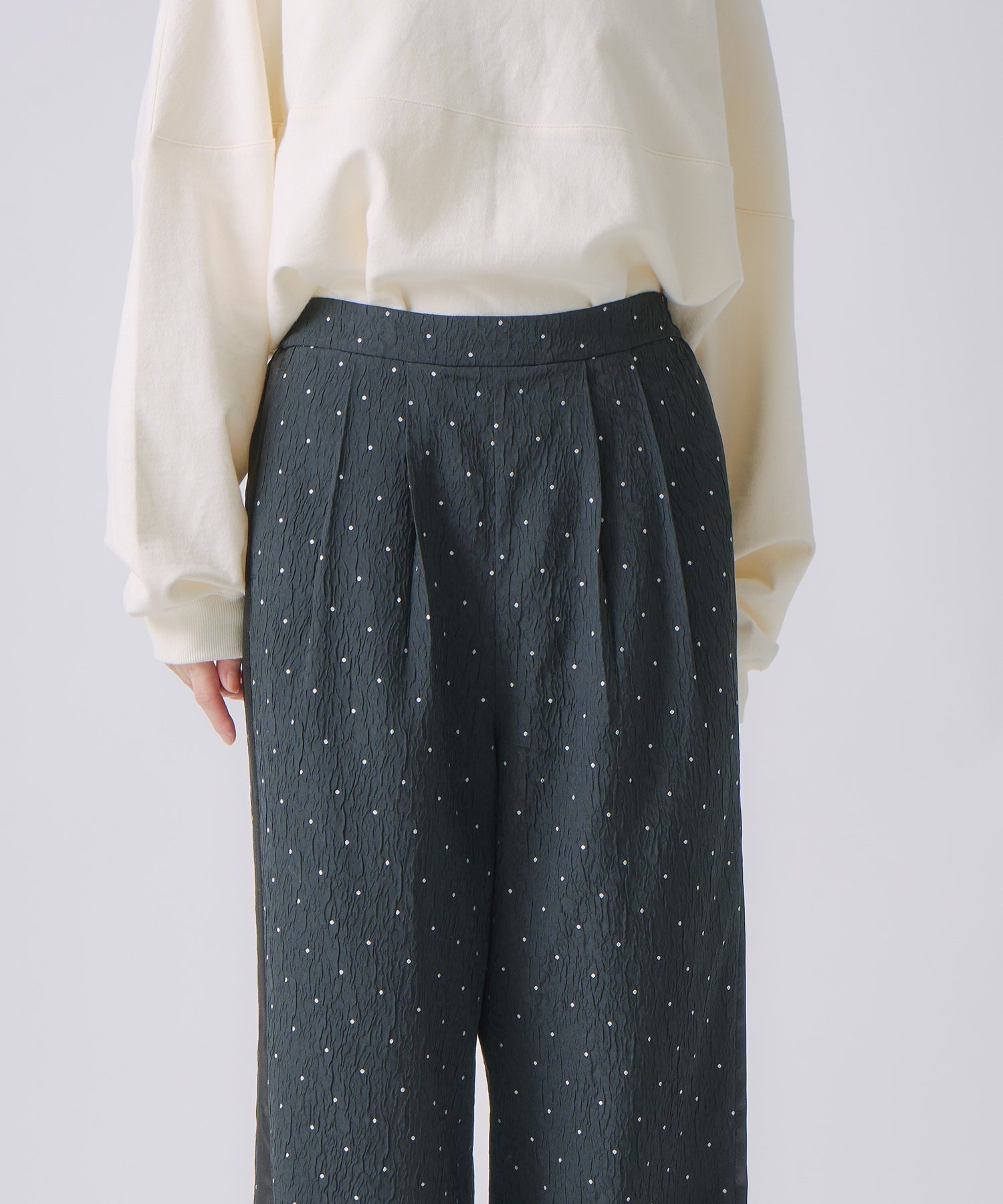 ジャガード素材に控えめなドット柄が繊細で、上品な質感が特徴的なパンツです。