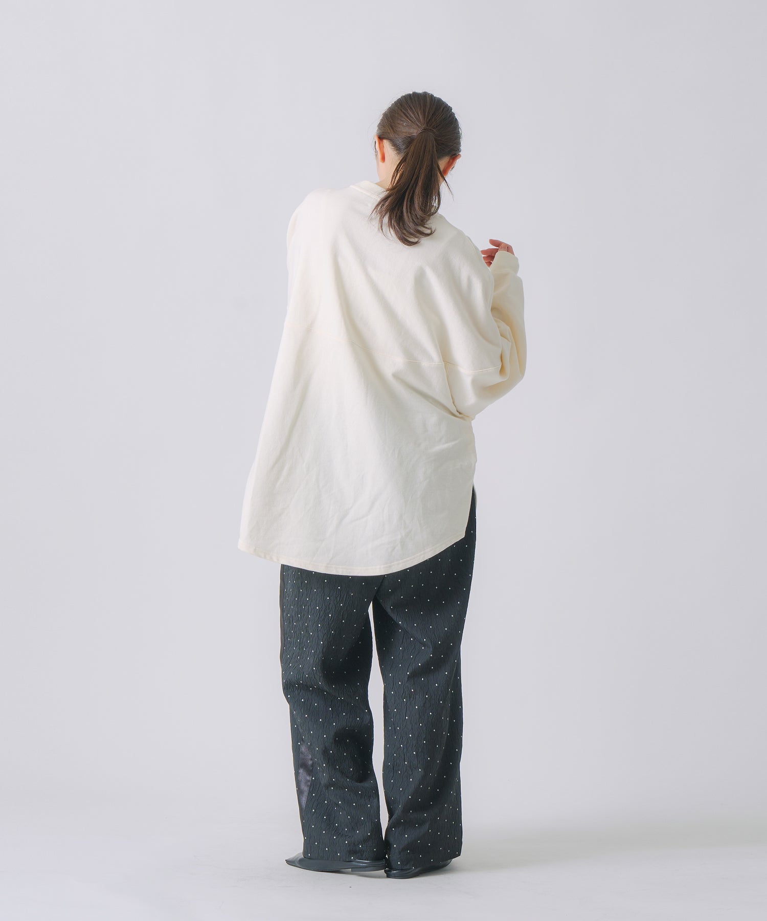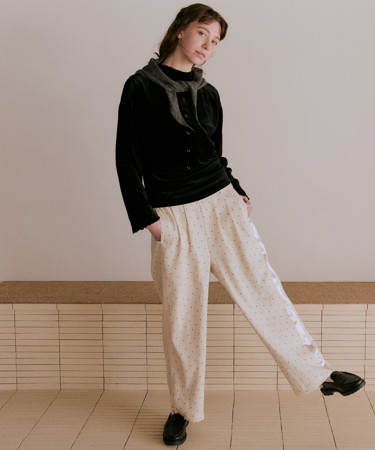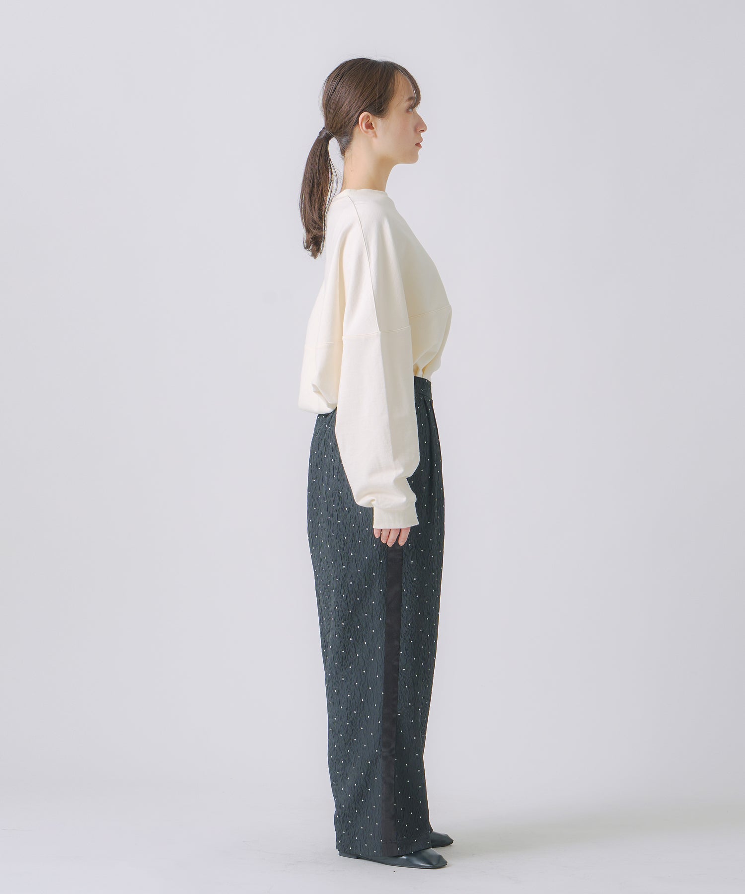 ジャガード素材に控えめなドット柄が繊細で、上品な質感が特徴的なパンツです。