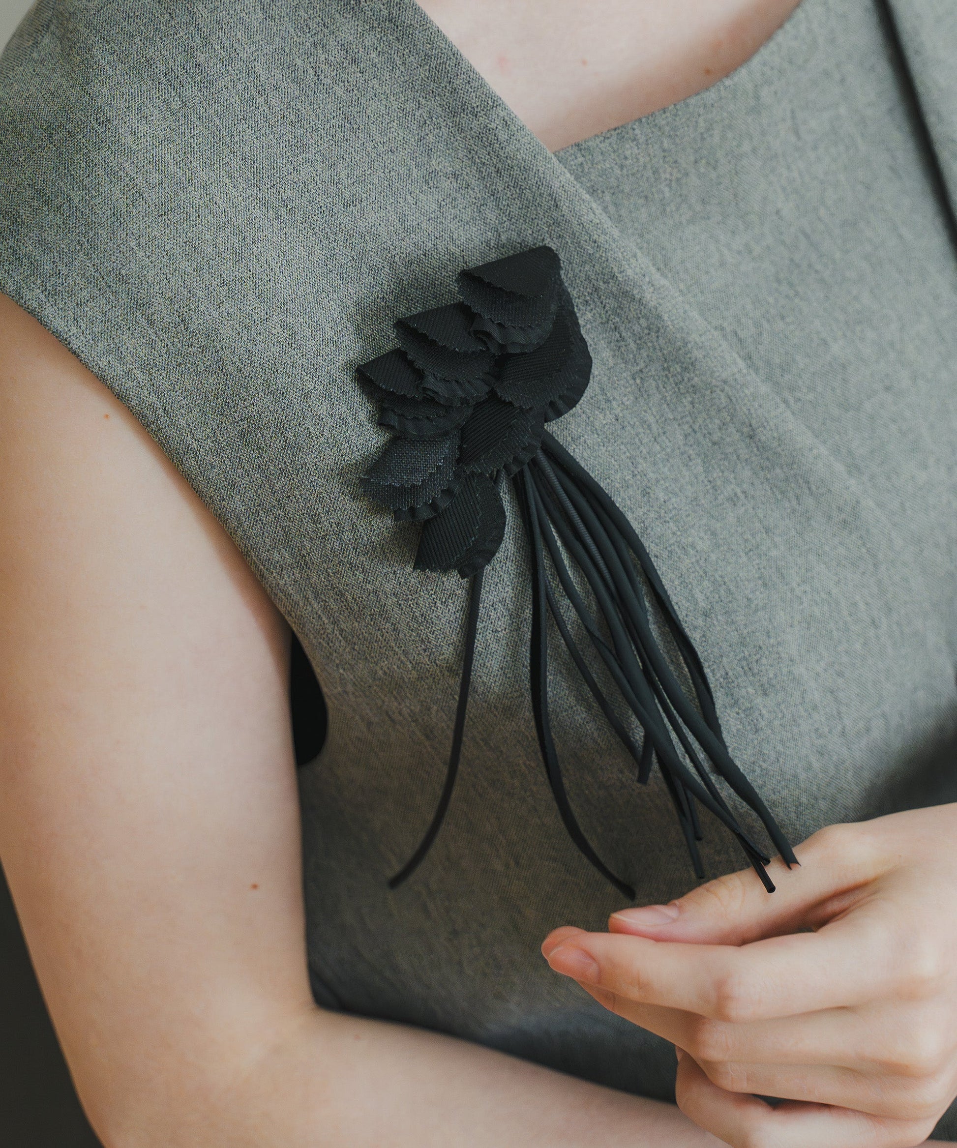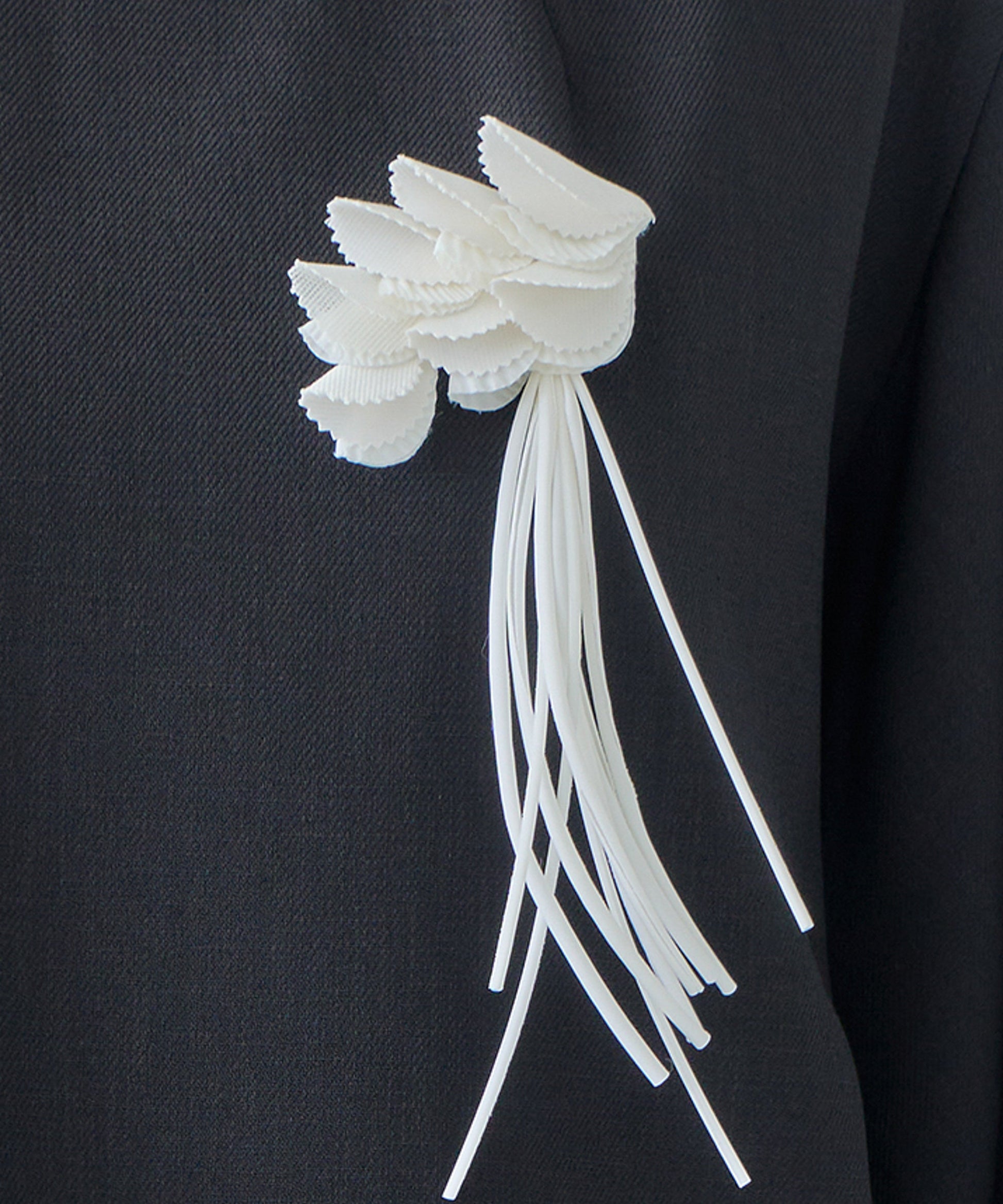 ブローチから垂らしたコードは取り外し可能なので、華やかにしたい時、抑えたい時、シチュエーションに応じて選んでいただけます。