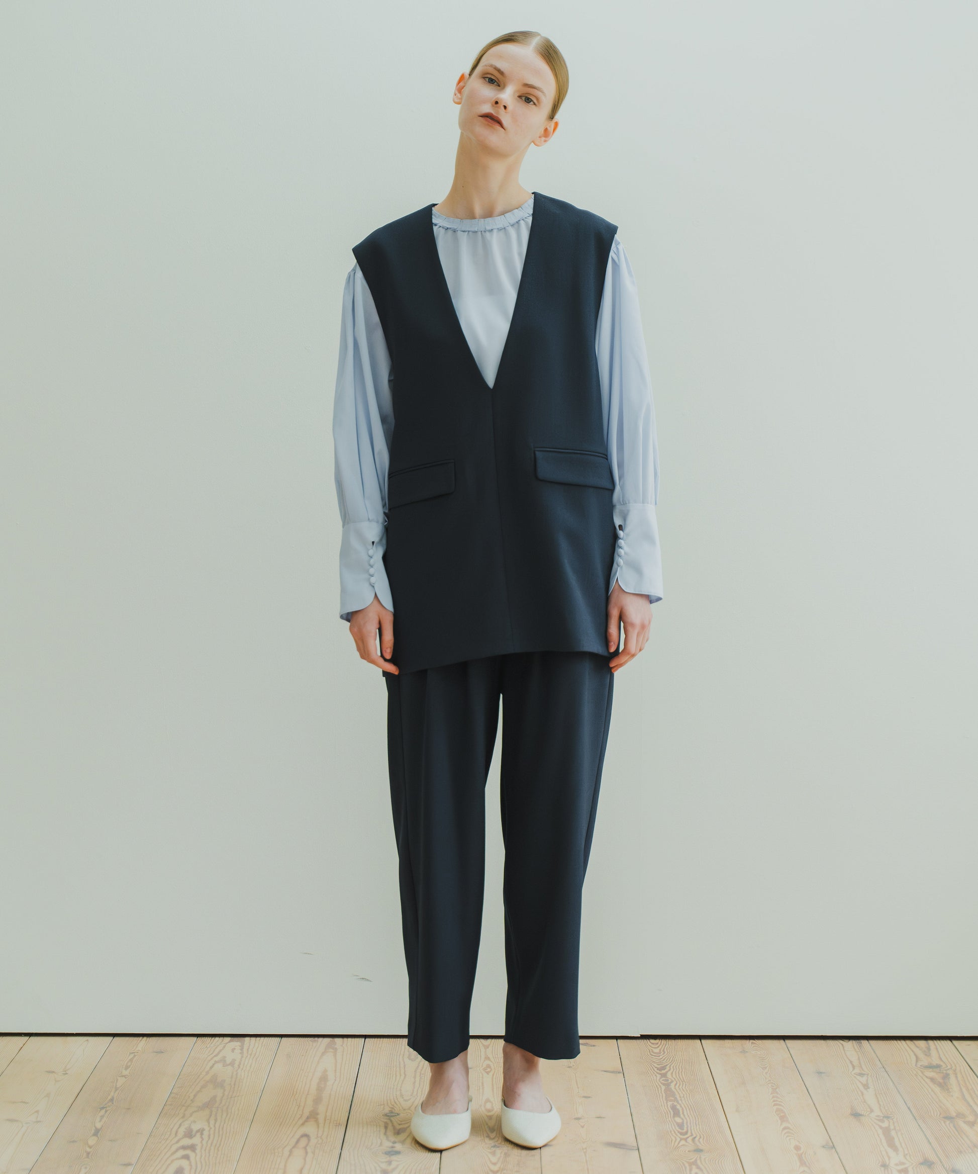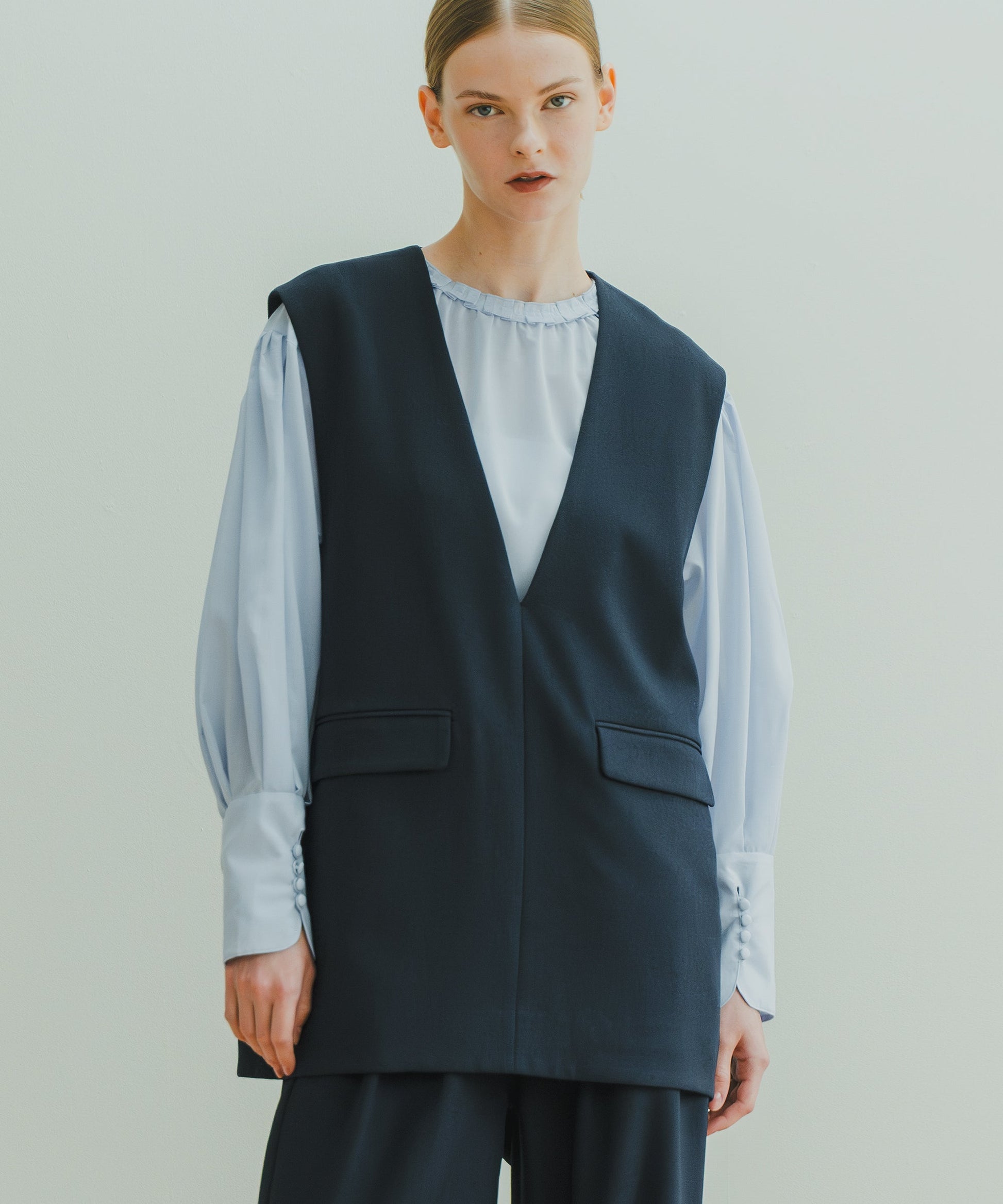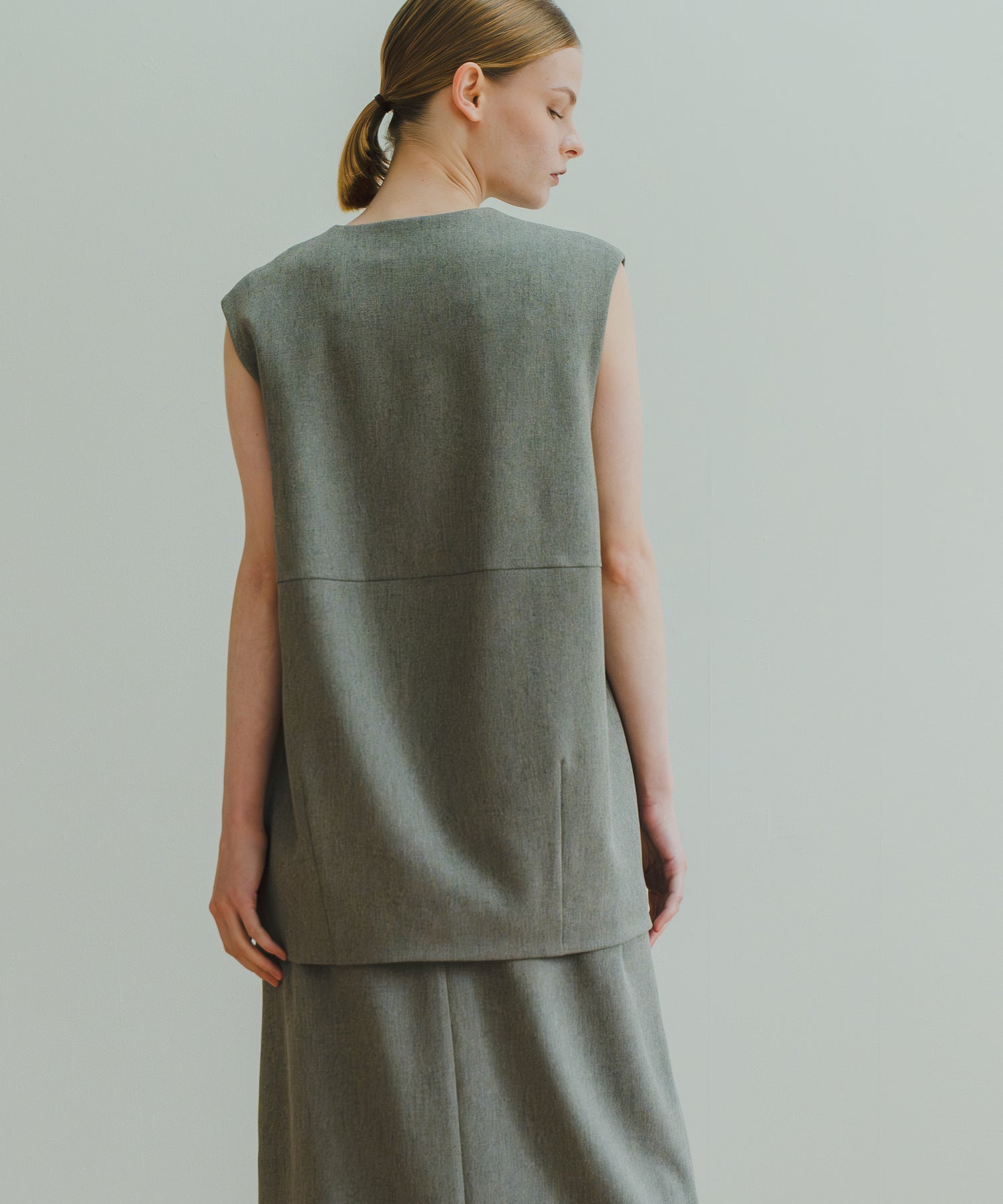 スッキリとしたスリットネックと、コクーンフォルムの印象的なベストです。