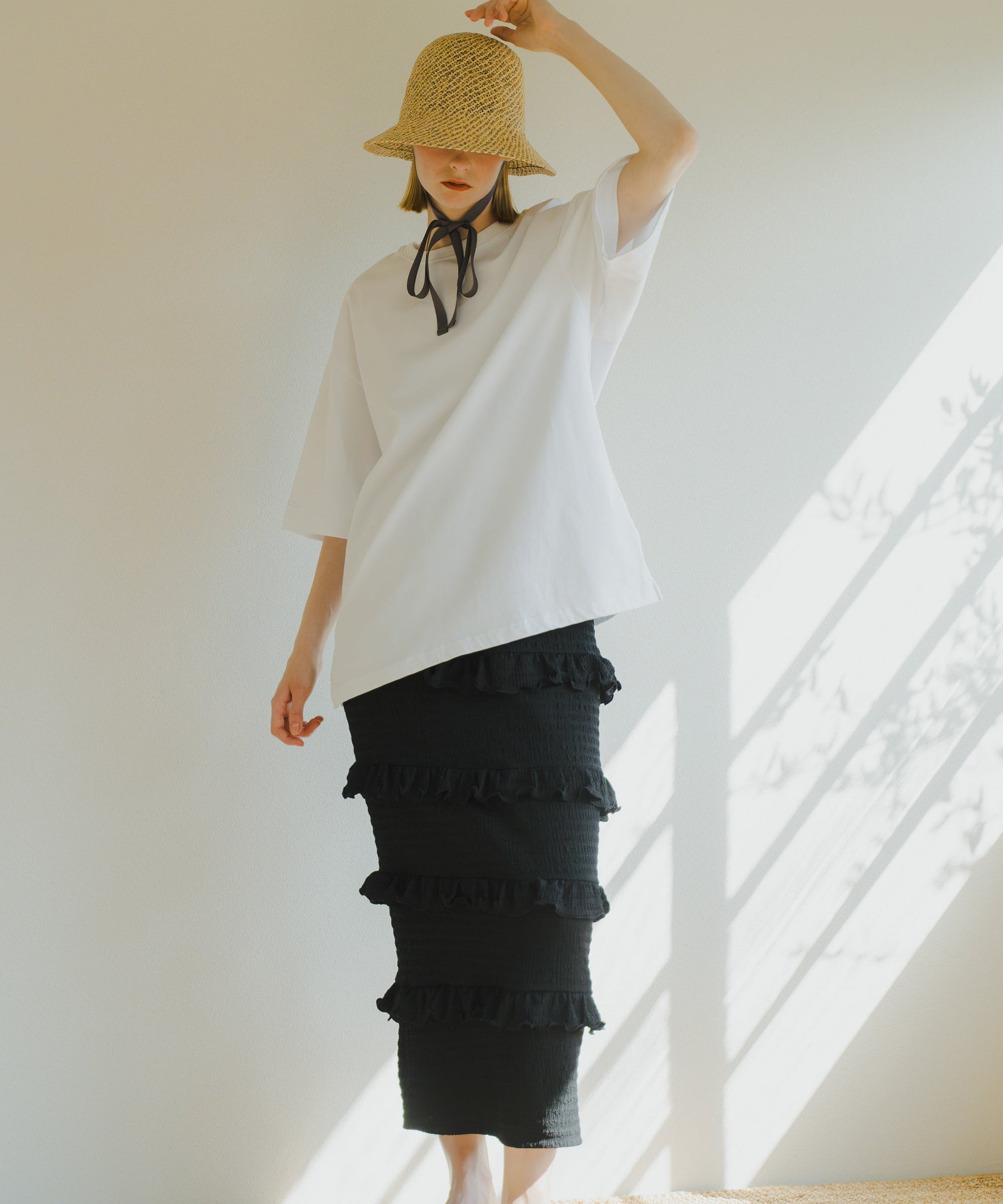 袖は少し長めの設定で、ゆったりとしたシルエット。着丈もヒップにかかるので、ライン気にせず着用していただけます。