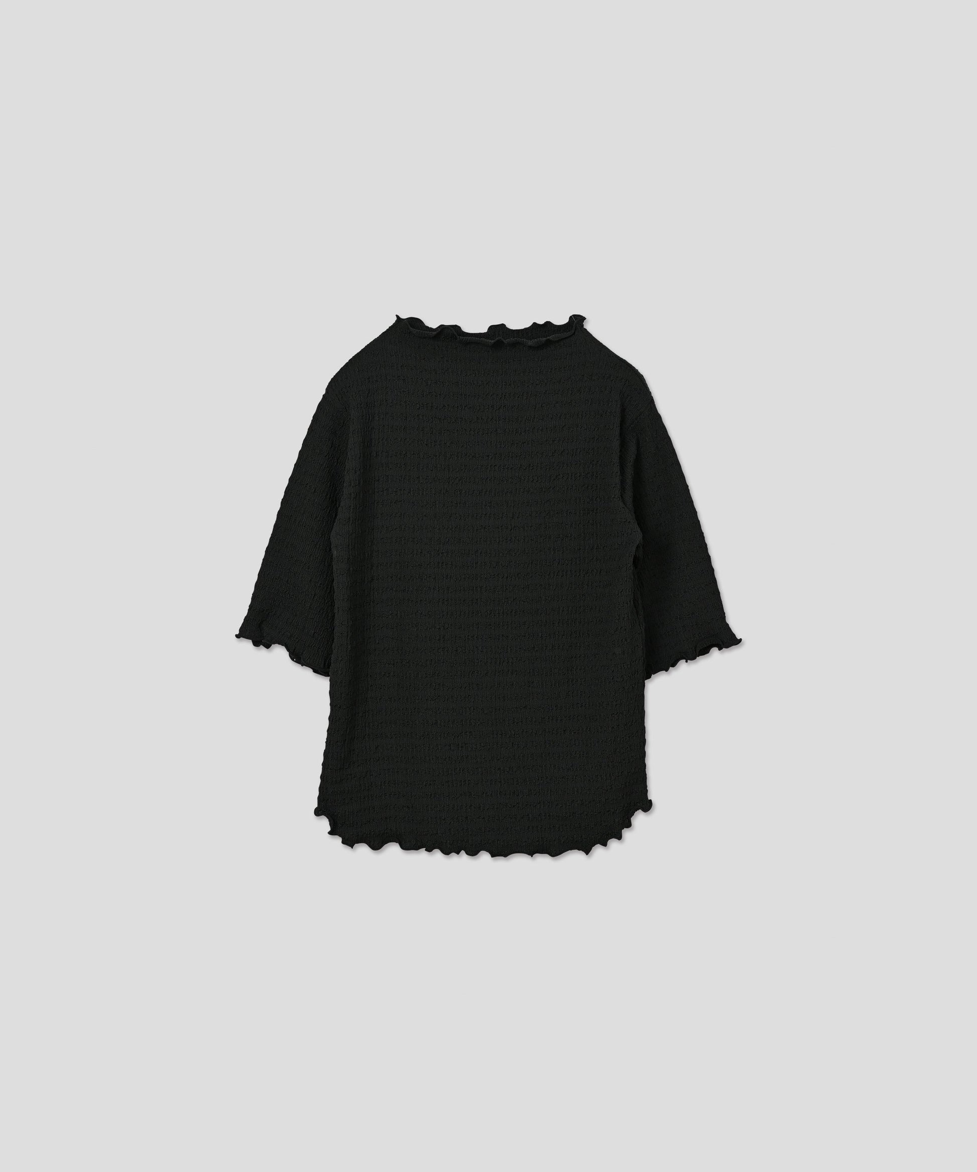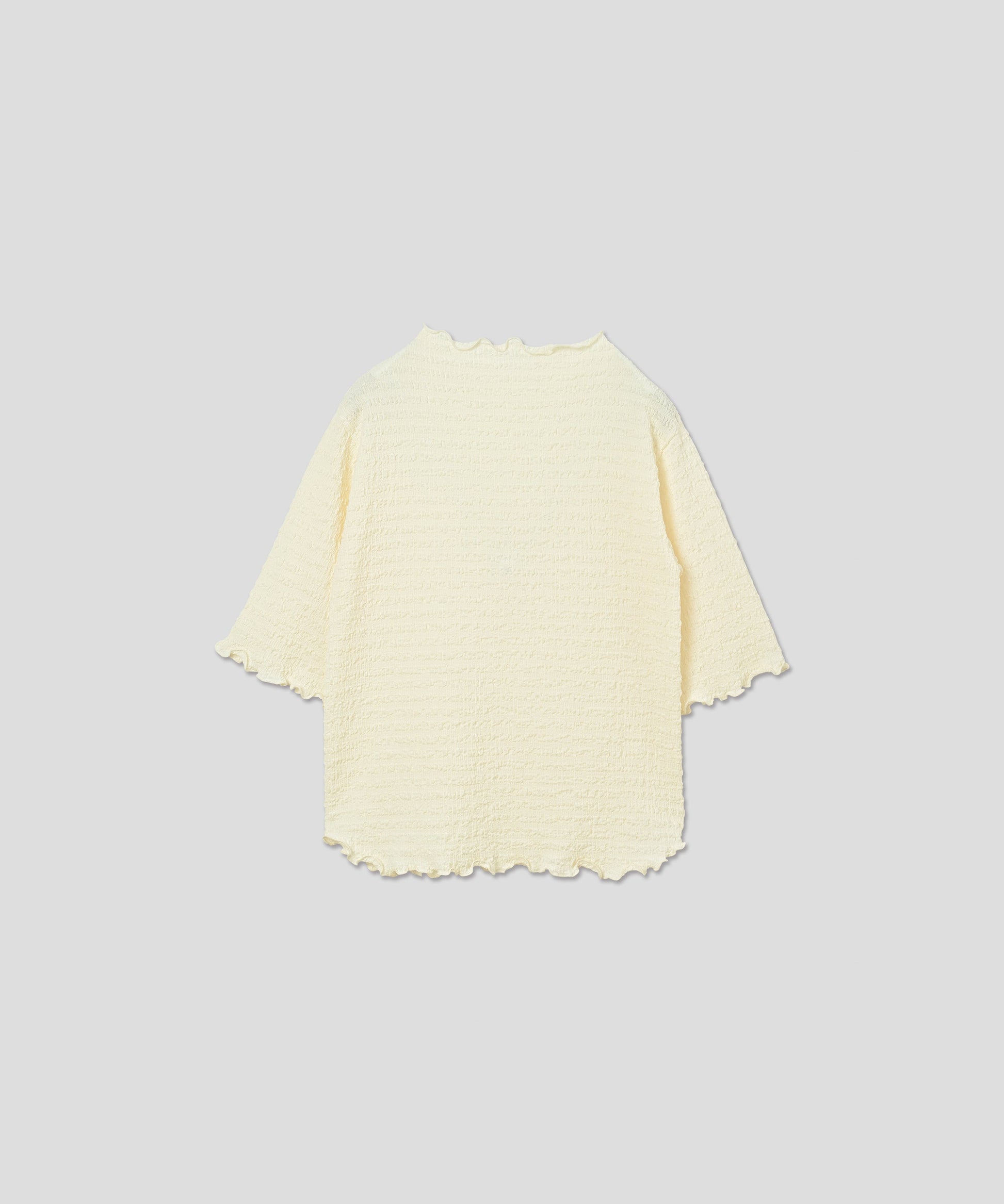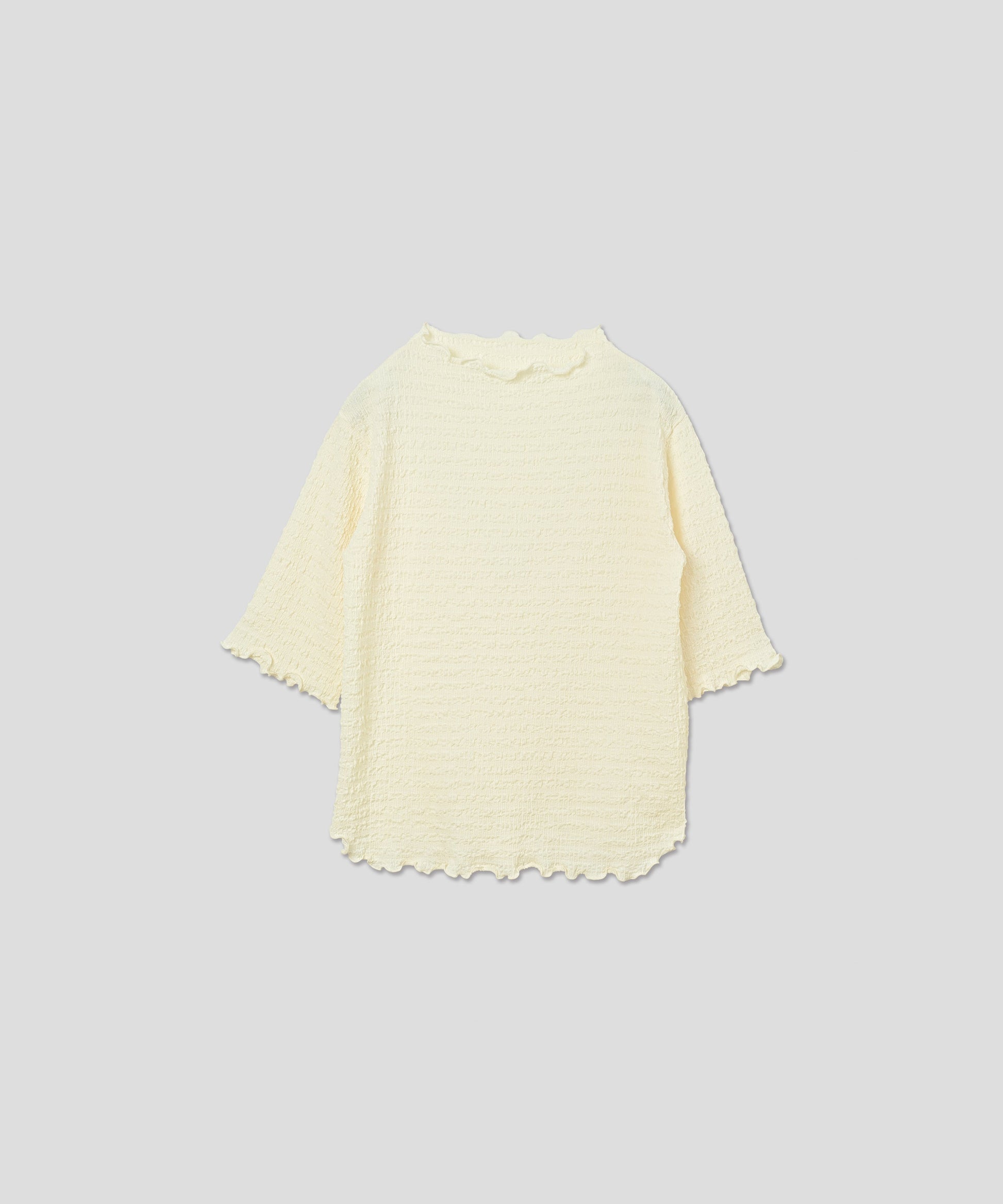 身頃からネックまでハギなしで立ち上げたモックネックが特徴的。