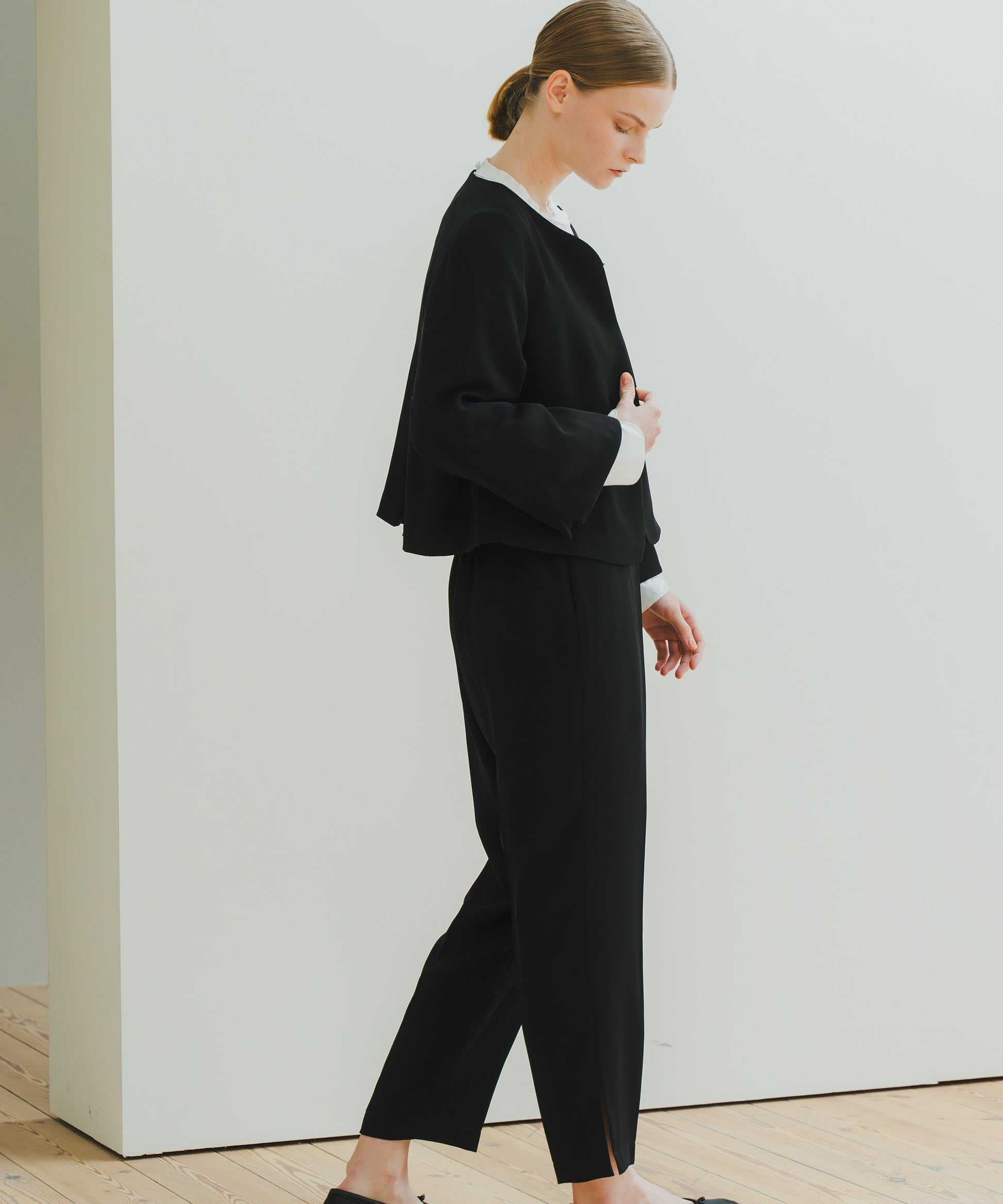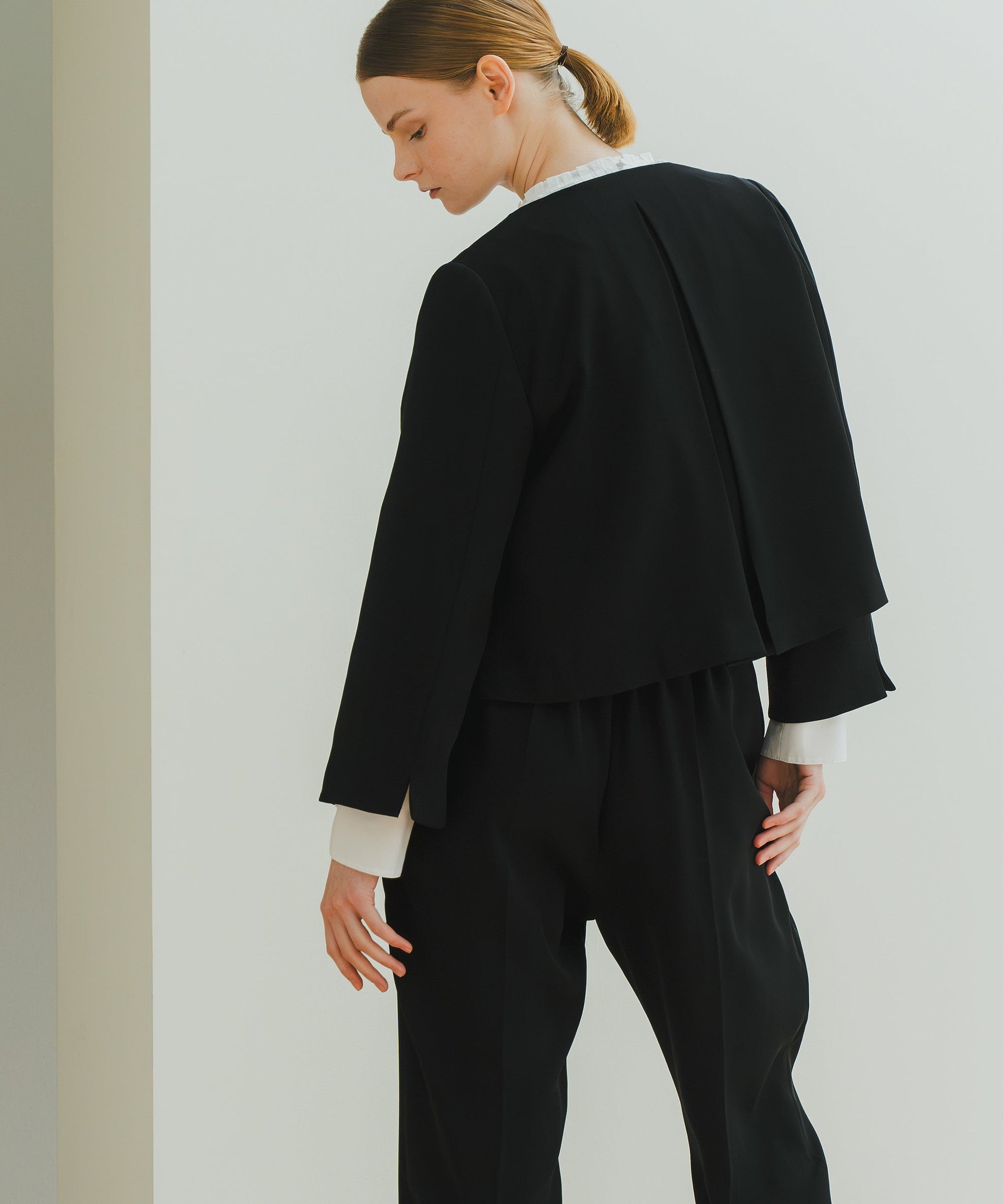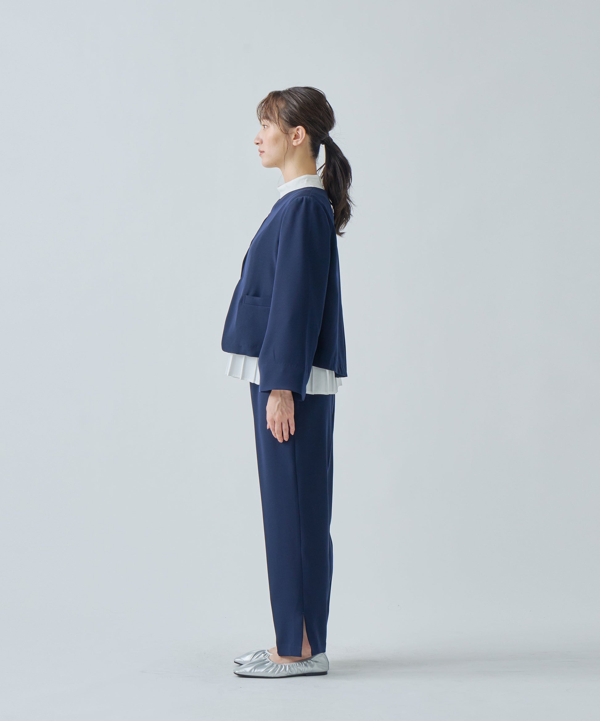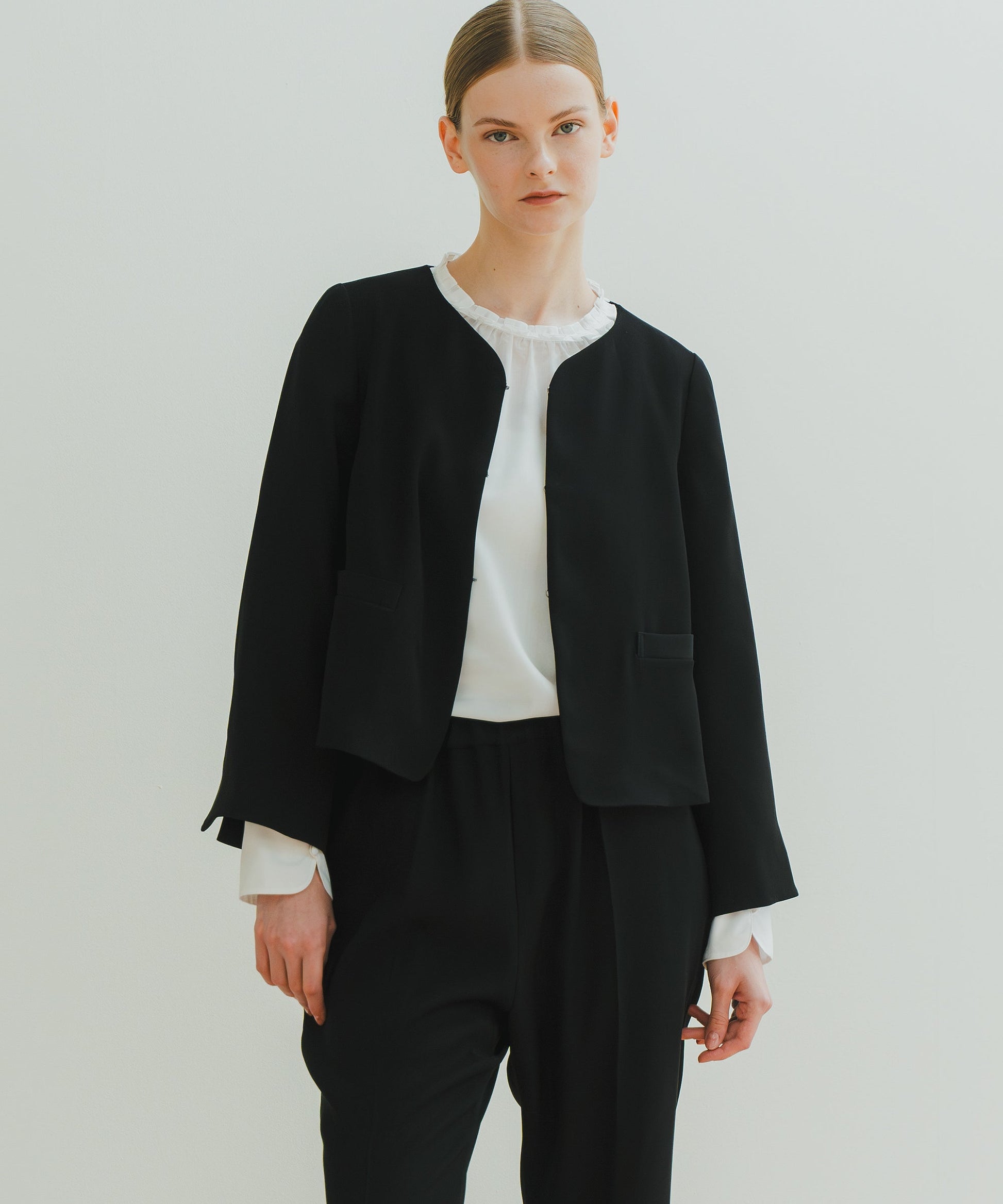 Aラインを軸に、袖もAラインに合わせて広がるようなラインでまとめたフォーマルジャケットです。
