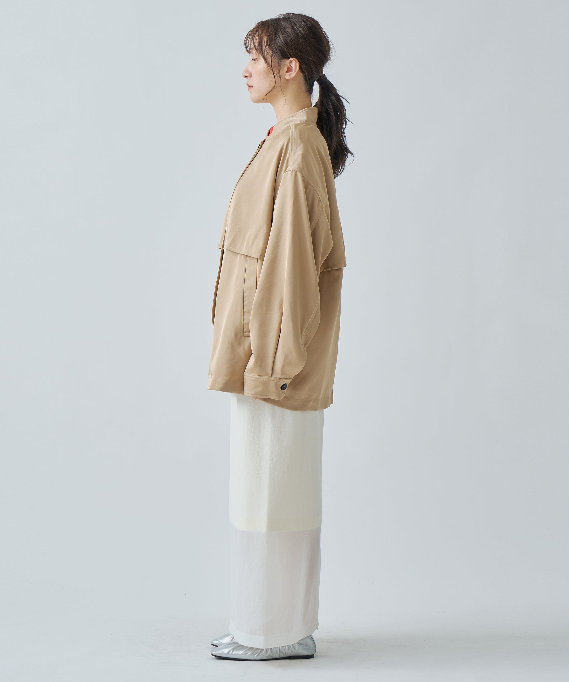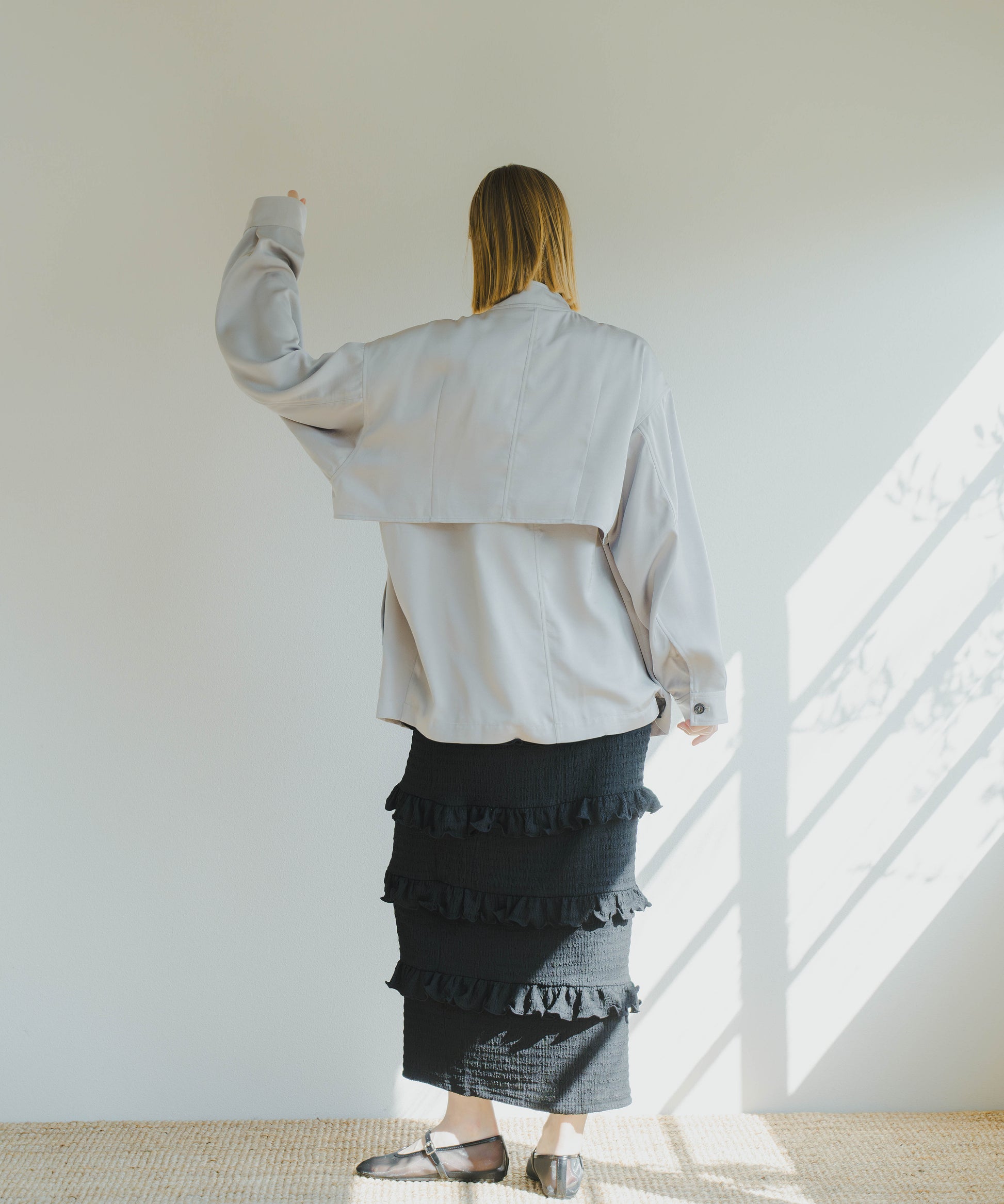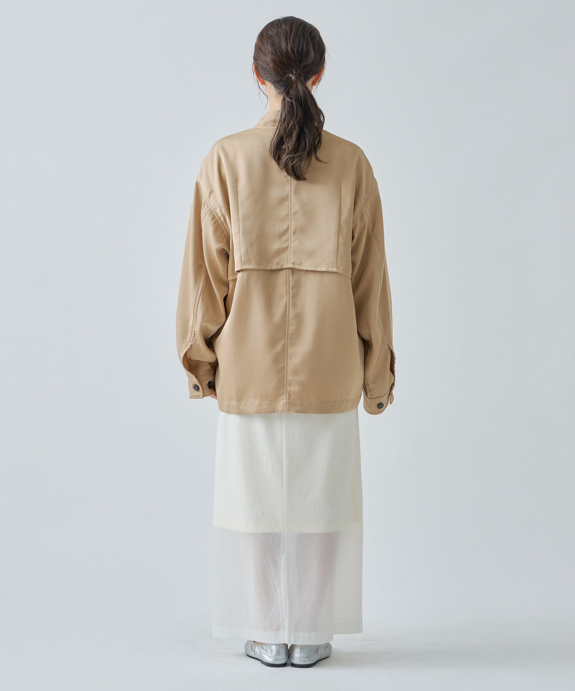 フロントはすっきりと、後ろは膨らみを持たせながら裾に向かってコクーンシルエットになっています。