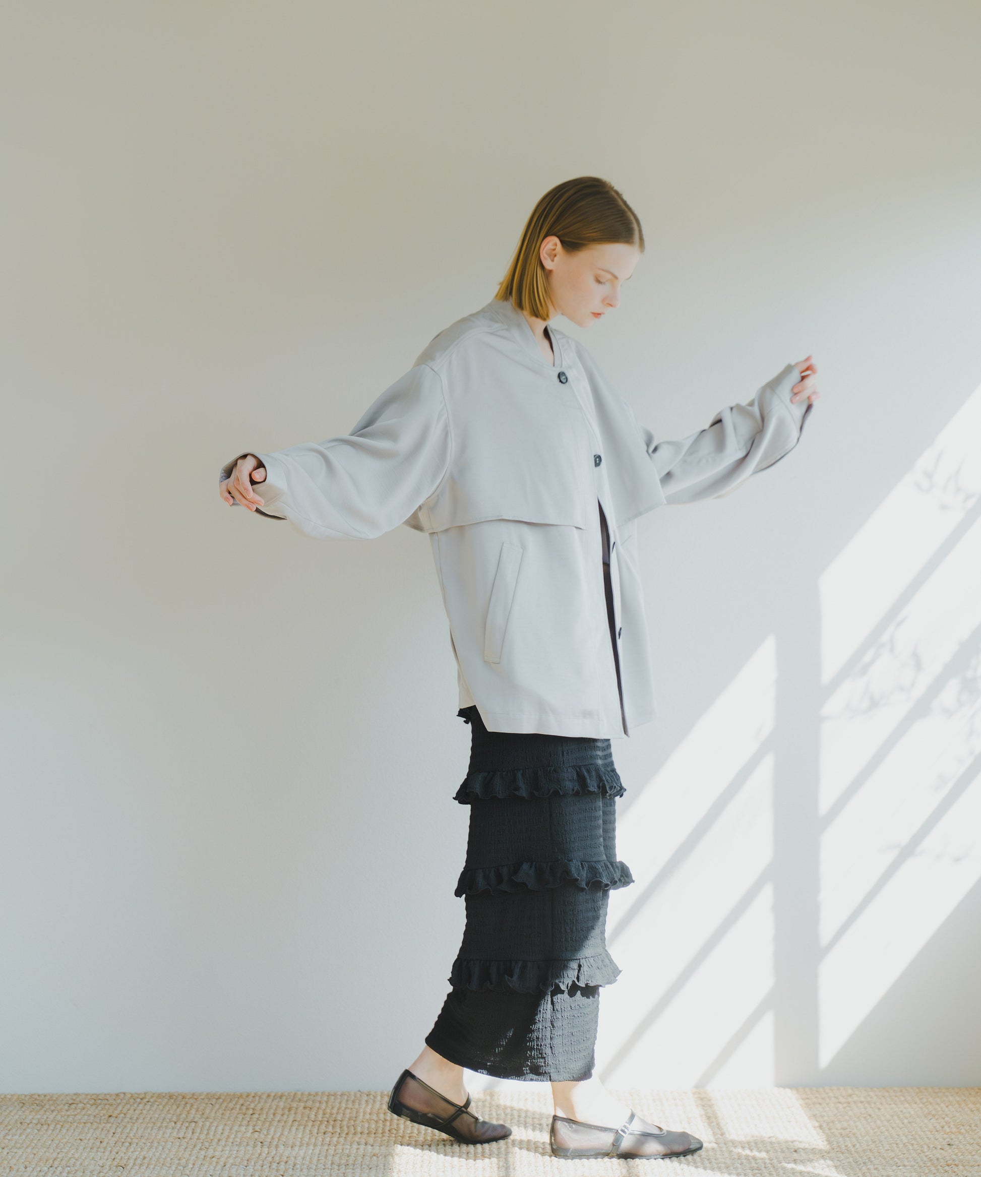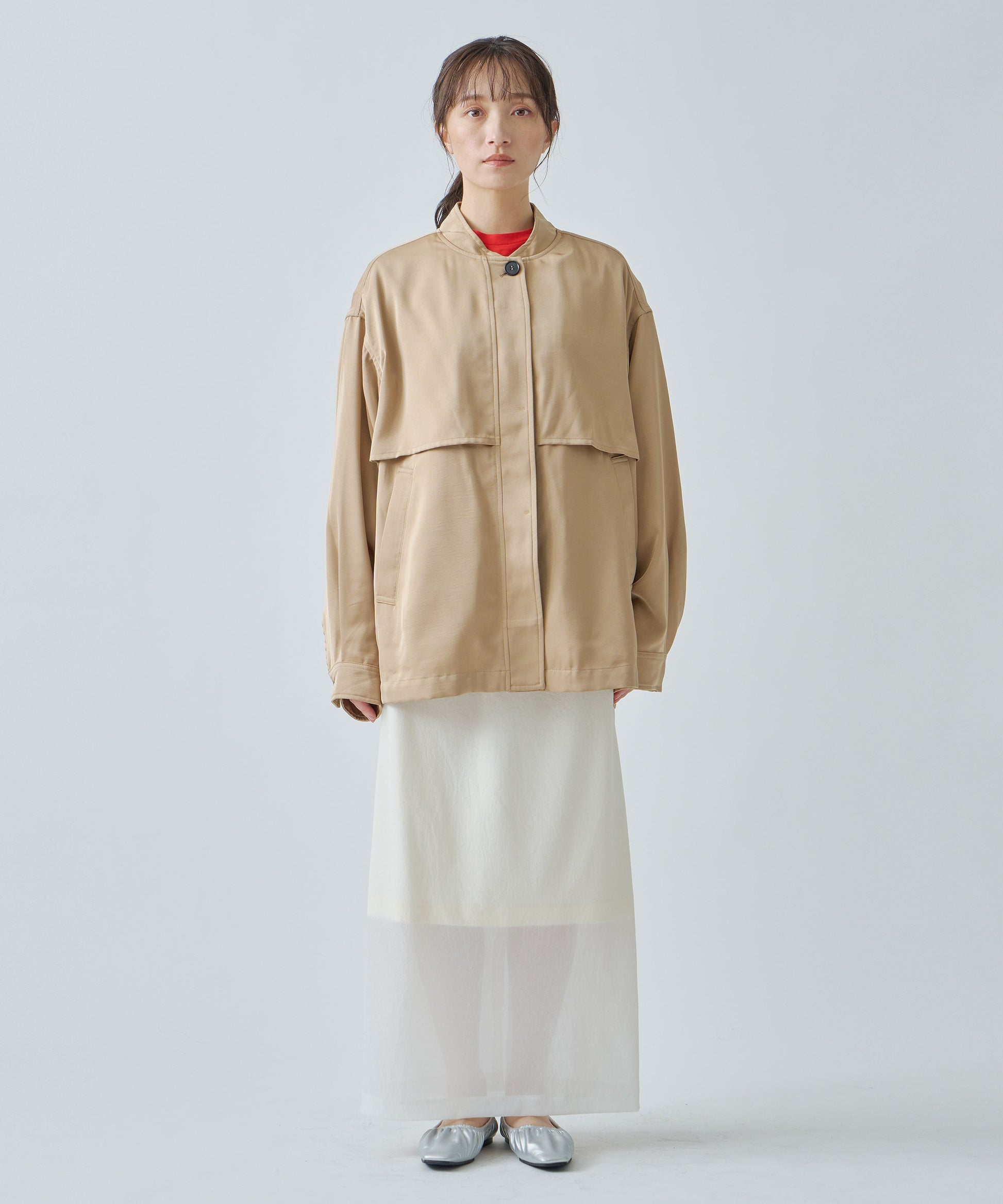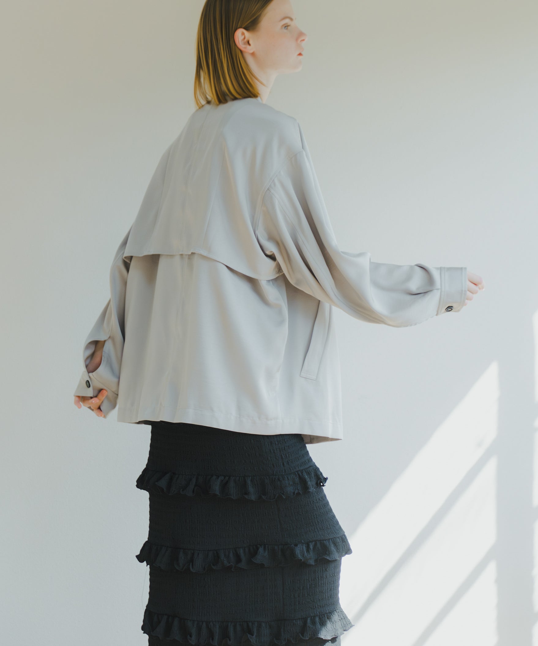 フロントはすっきりと、後ろは膨らみを持たせながら裾に向かってコクーンシルエットになっています。